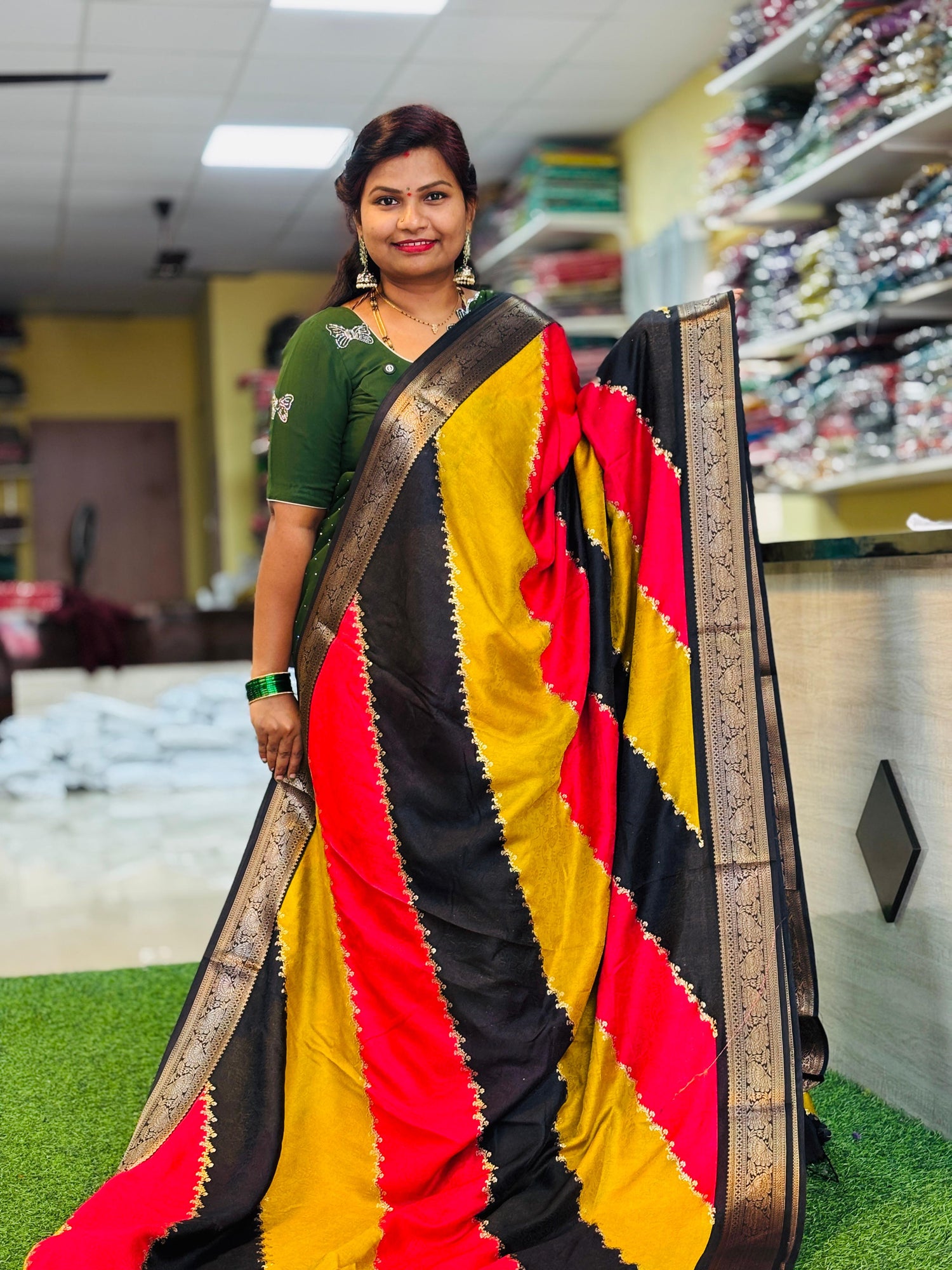 ನೇಯ್ಗೆ ಬಾರ್ಡರ್ಗಳೊಂದಿಗೆ ಡೋಲಾ ಕ್ರೆಪ್ ರೇಷ್ಮೆ ಸೀರೆಗಳು ಕಾಂಟ್ರಾಸ್ಟ್ ಬ್ಲೌಸ್ ಪರಿಕಲ್ಪನೆ ಮುದ್ದಾದ ಟಸ್ಲ್ಸ್ನೊಂದಿಗೆ ಹೈಲೈಟ್...