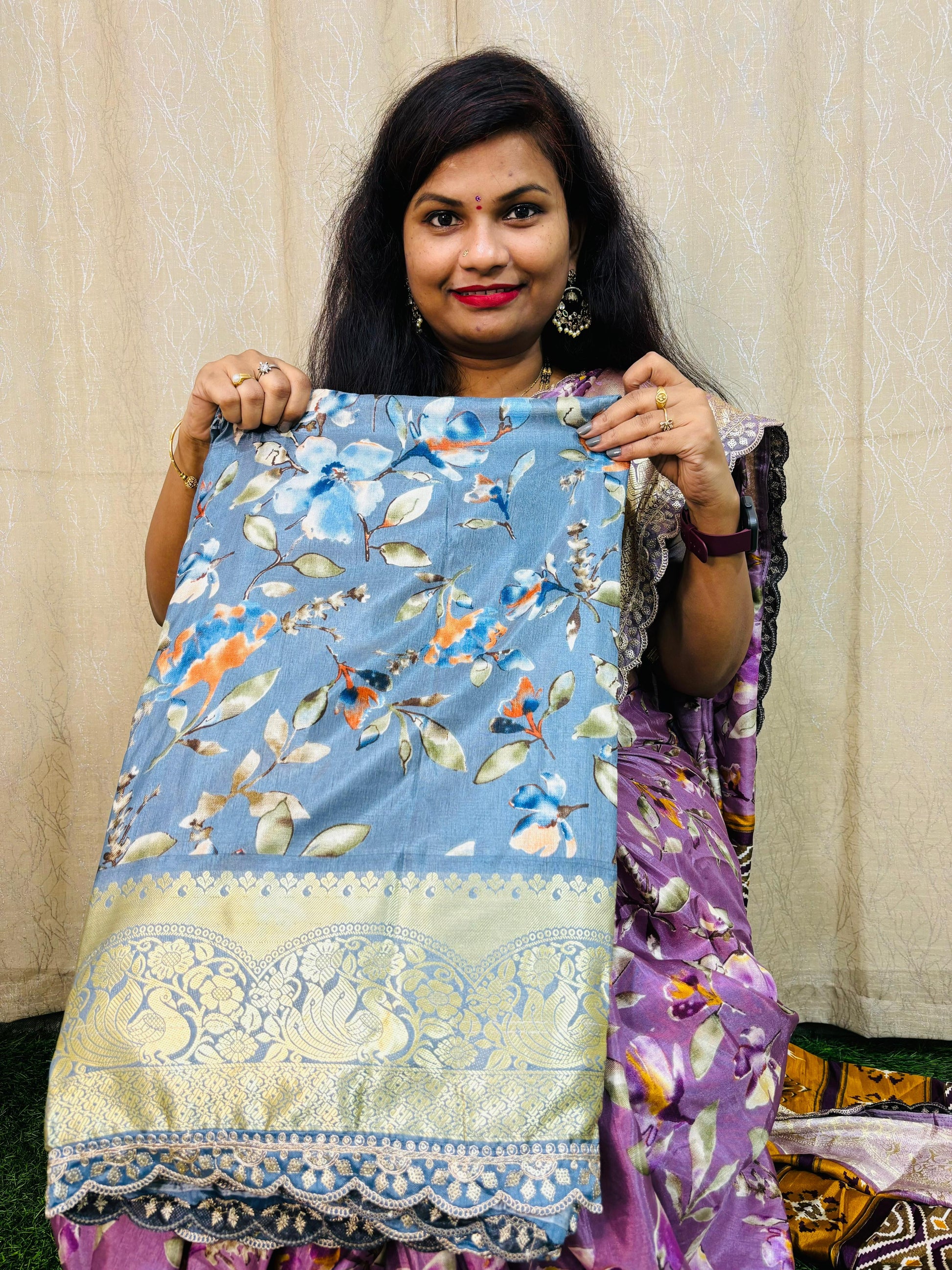 Premium Dola crepe upgrade your wardrobe with our expertly crafted Dola Crepe blouse, featuring a delicate scallop border and elegant peacock zari detailing. Made of premium Dola crepe, and finished with a stunning contrast ikkath pallu, this blouse will elevate any outfit. Stand out with style, confidence, and quality.