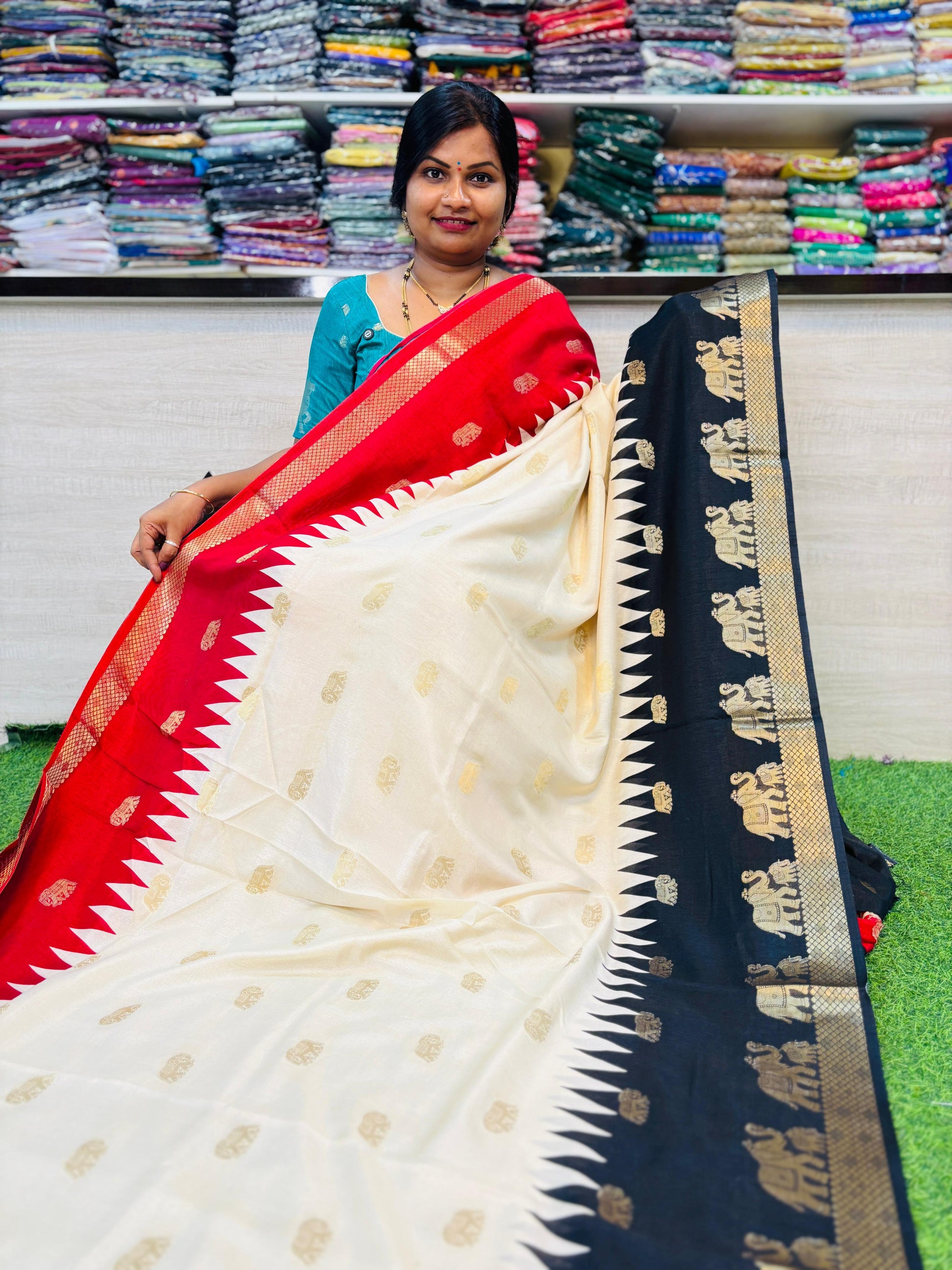Experience the traditional craftsmanship with our Ganga Jamuna Borders. The intricate temple print border and rich pallu add a touch of elegance to your attire. Immerse yourself in the beauty of allover deer weaving butties, perfect for any occasion.