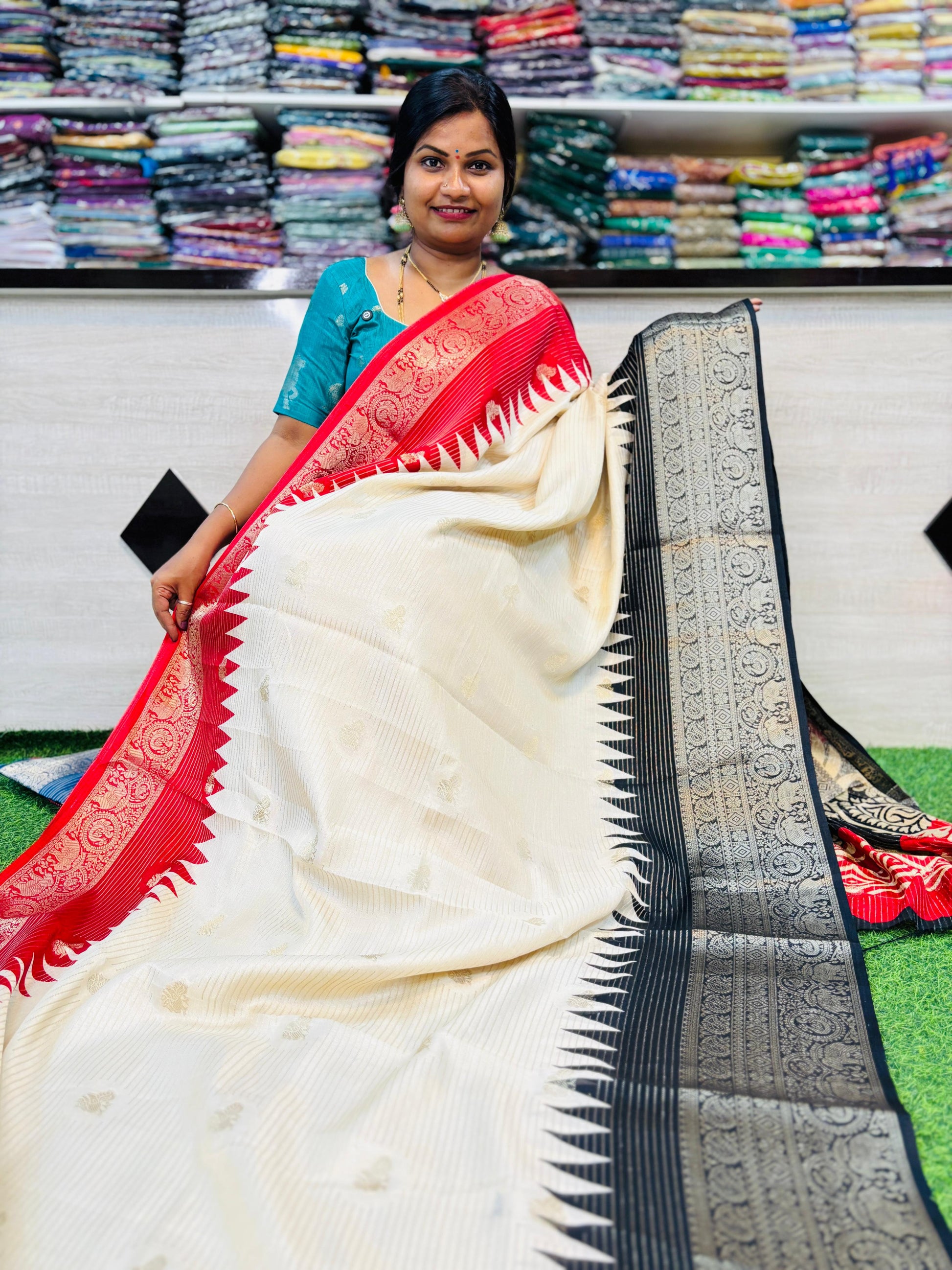 Experience the traditional craftsmanship with our Ganga Jamuna Borders. The intricate temple print border and rich pallu add a touch of elegance to your attire. Immerse yourself in the beauty of allover deer weaving butties, perfect for any occasion.