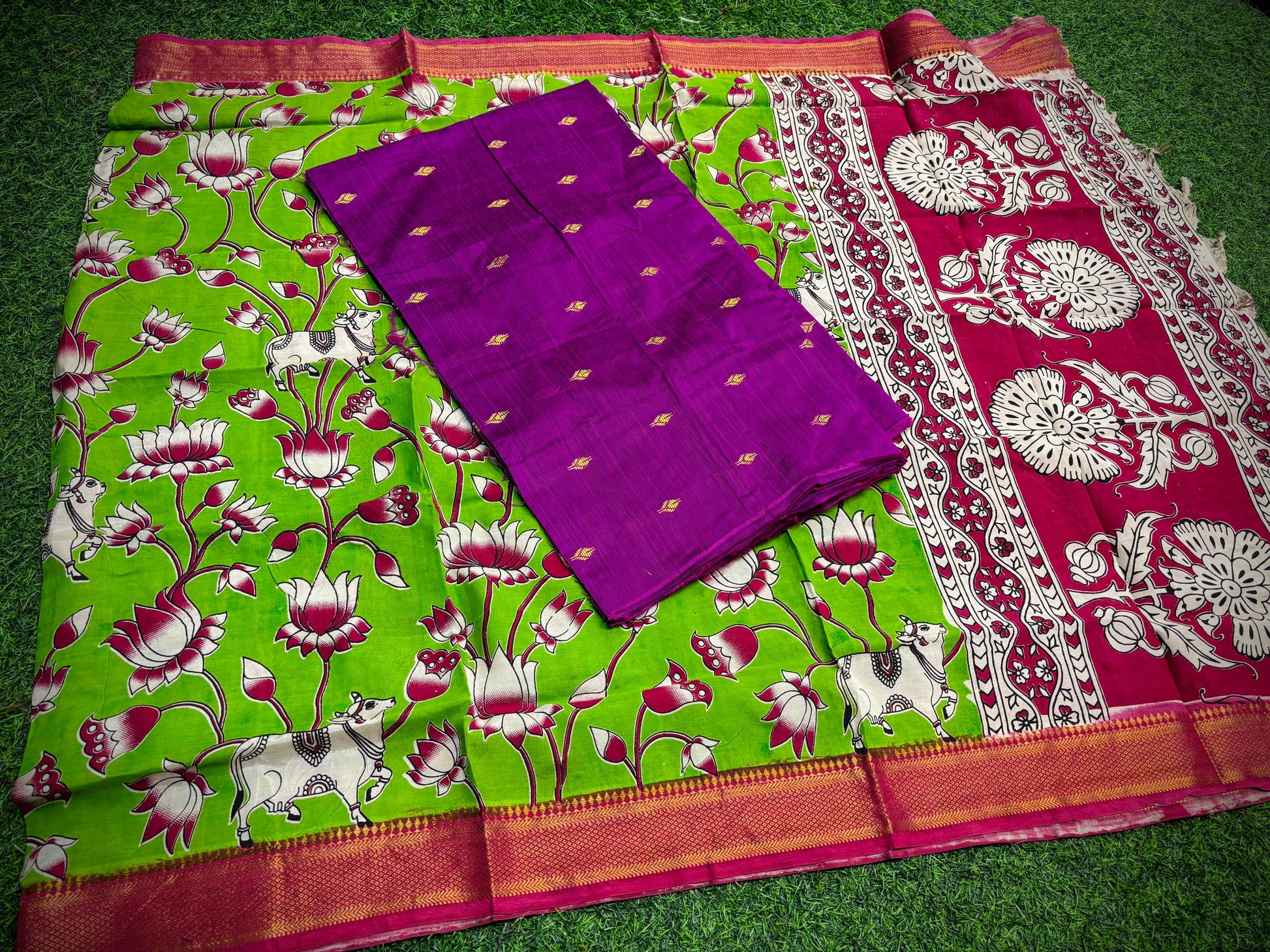 "This Kalamkari dress material includes a 2.5 mtr length with a 42 inch Panna, and comes with a beautiful Kalamkari silk Dupatta featuring a Nijam Border and charming Tussels. Perfect for any occasion."
