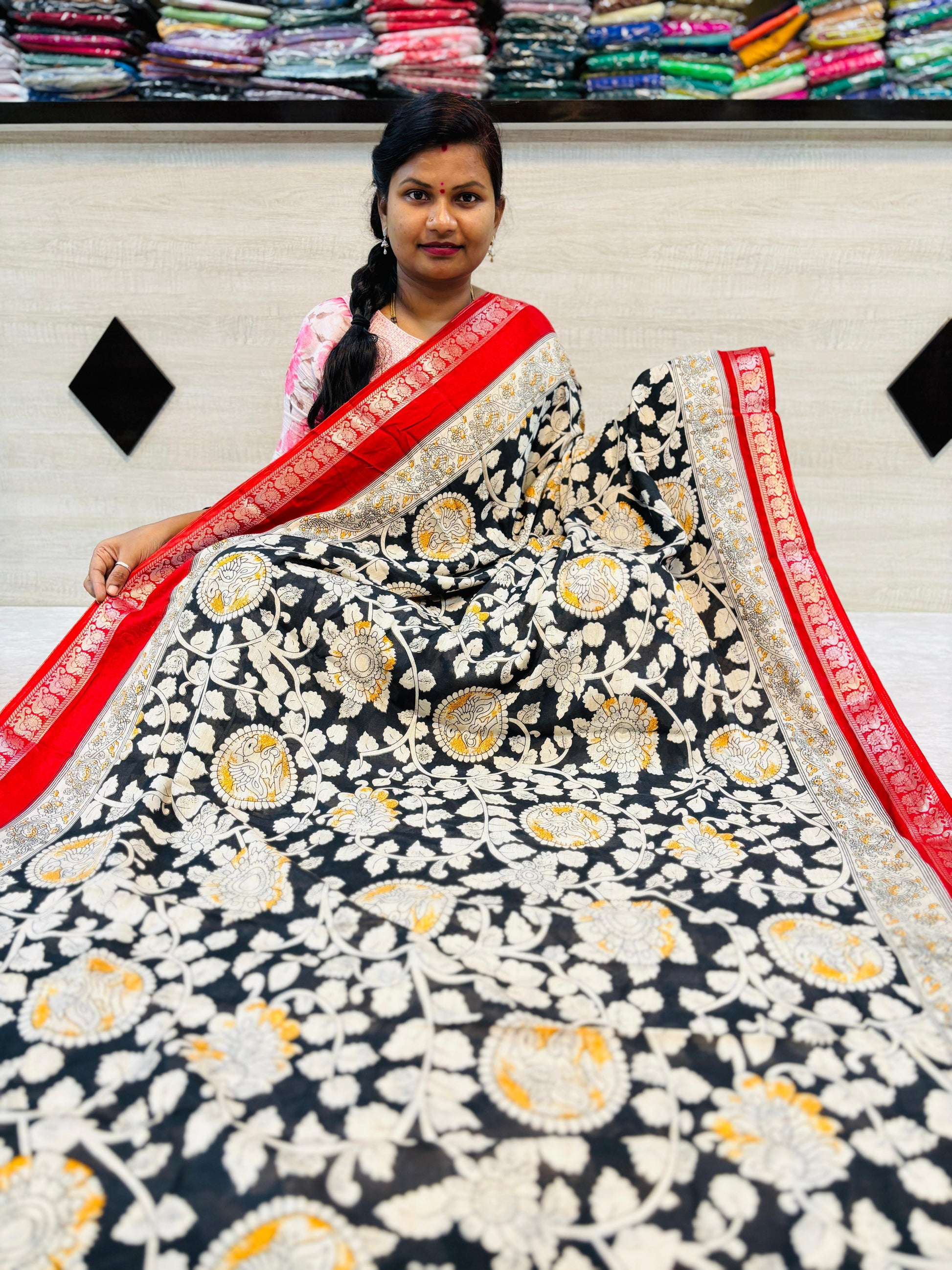 Experience the luxurious feel of Kalamkari Maheswari silk at an affordable price of 950/-. Made from the finest quality silk, this product showcases intricate Kalamkari designs, adding a touch of elegance to your wardrobe. Indulge in the comfort, style, and authenticity of this Indian traditional fabric.