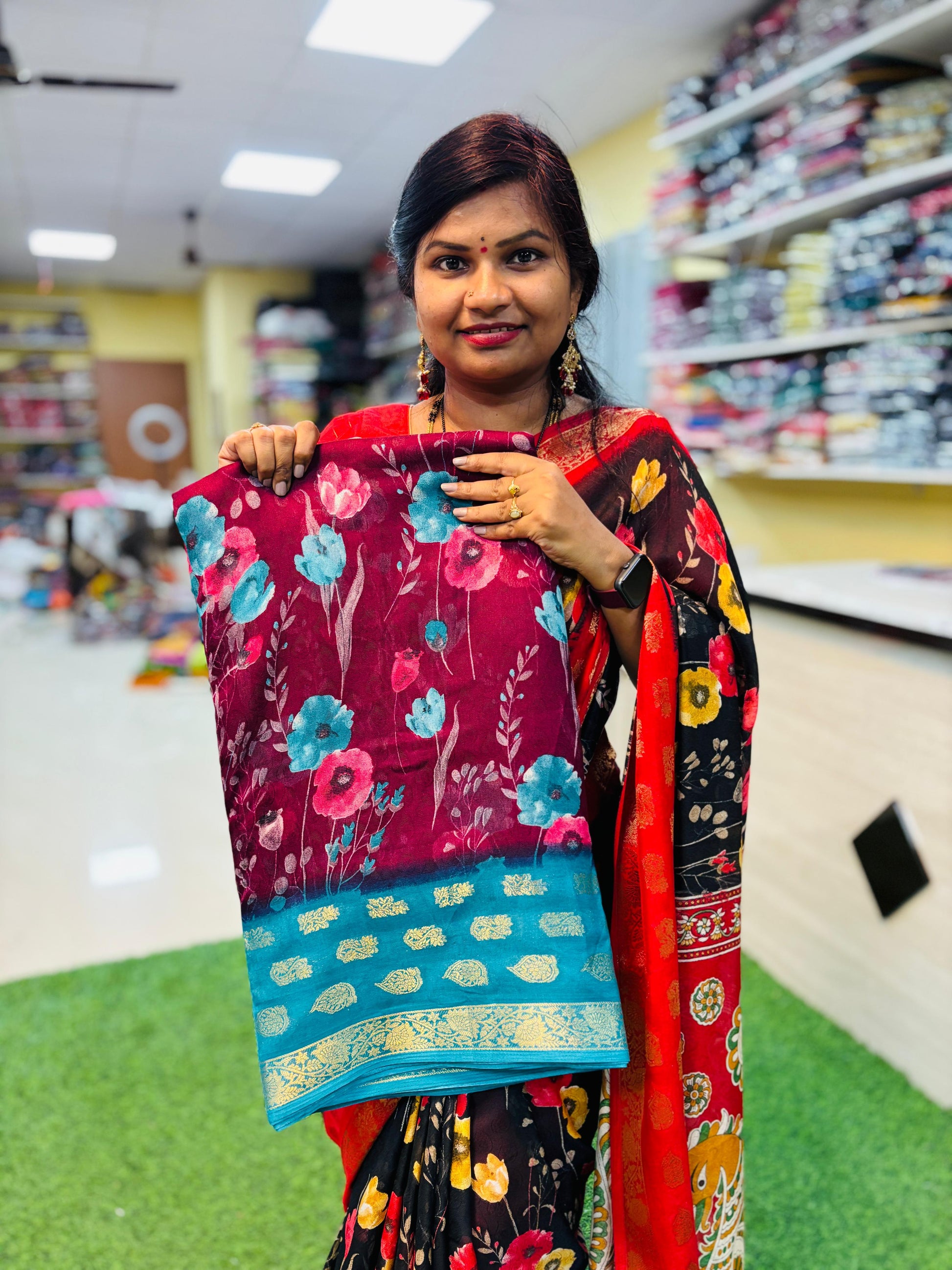 The saree features a vibrant contrast border, adding richness and definition to the overall design. Paired with bold floral patterns, it creates the perfect blend of modern chic and traditional beauty.