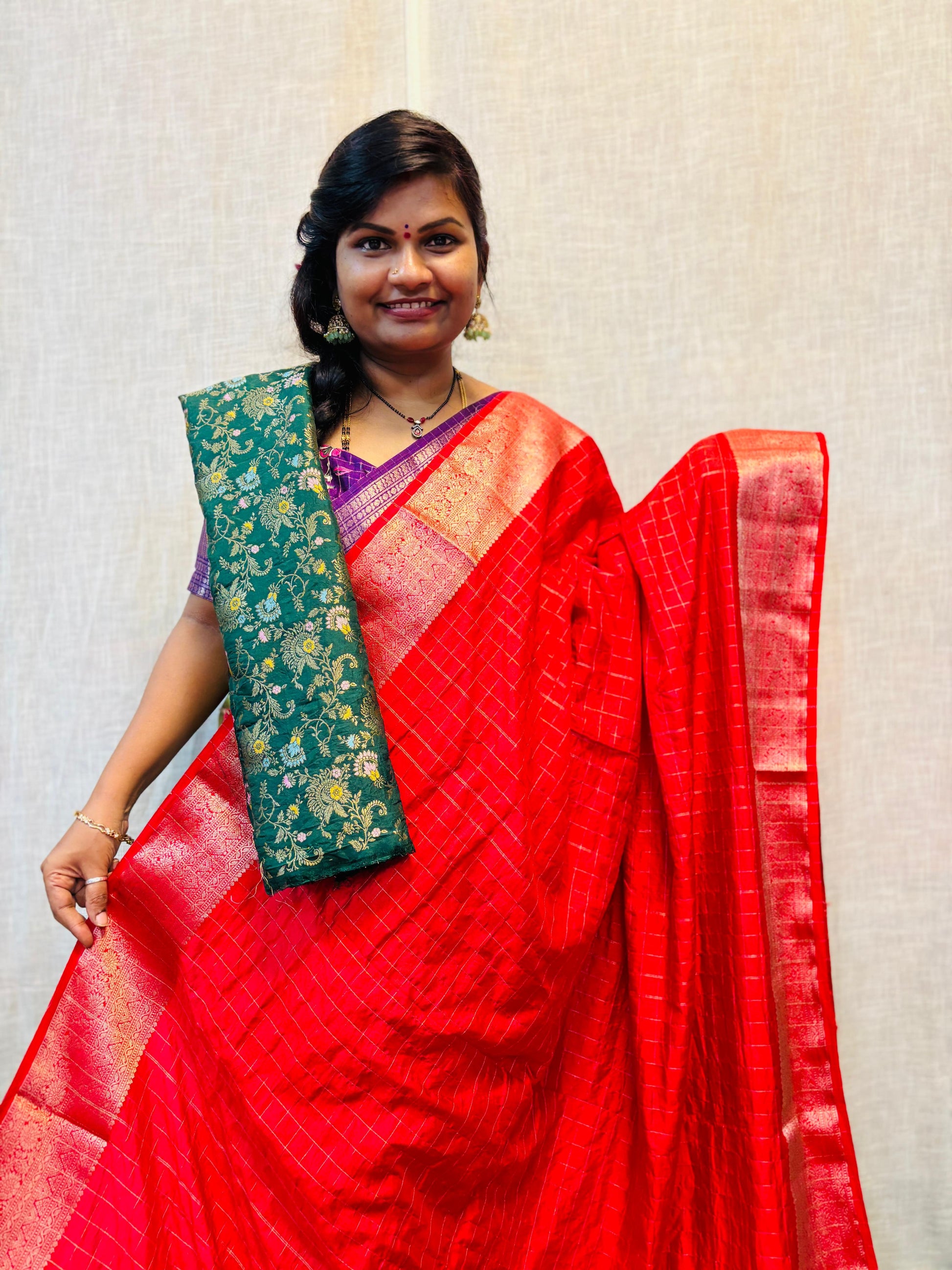 Expertly crafted from luxurious Moonga Pattu fabric, this saree features intricate all-over check weavings and a stunning Kanchi border. The rich line pallu adds a touch of elegance to this traditional ensemble. Perfect for any occasion, this saree will make you feel confident and stylish.