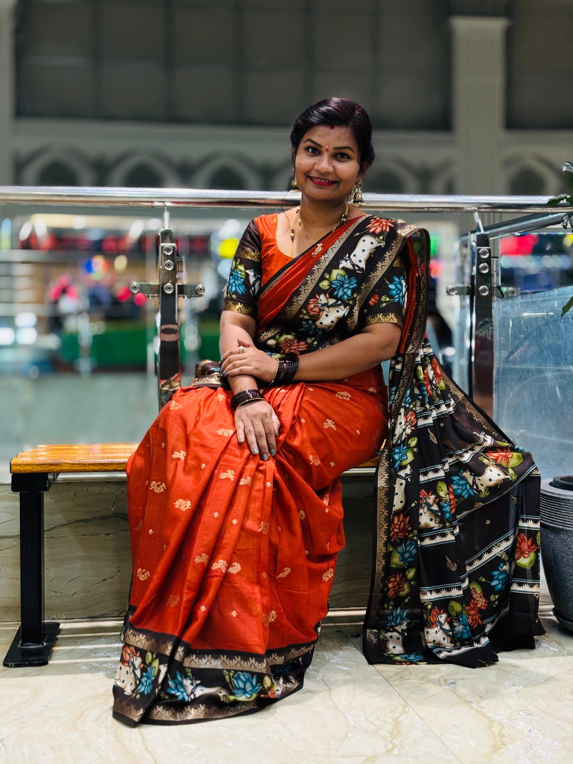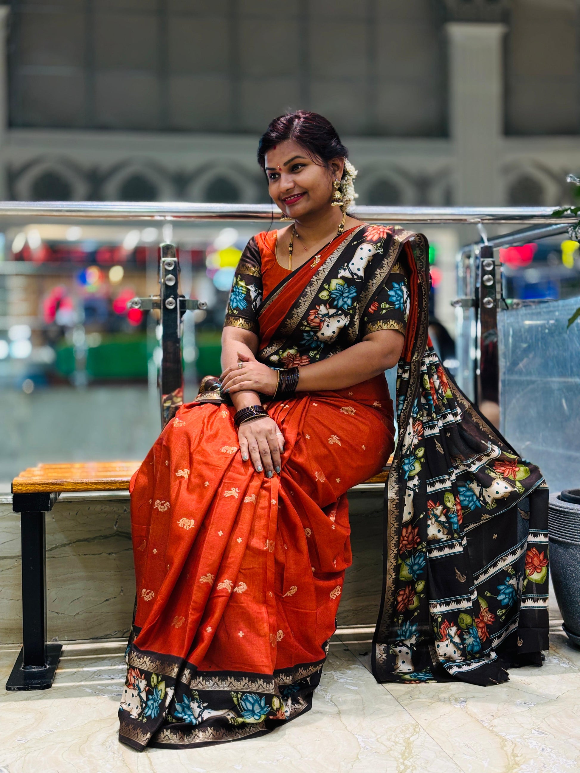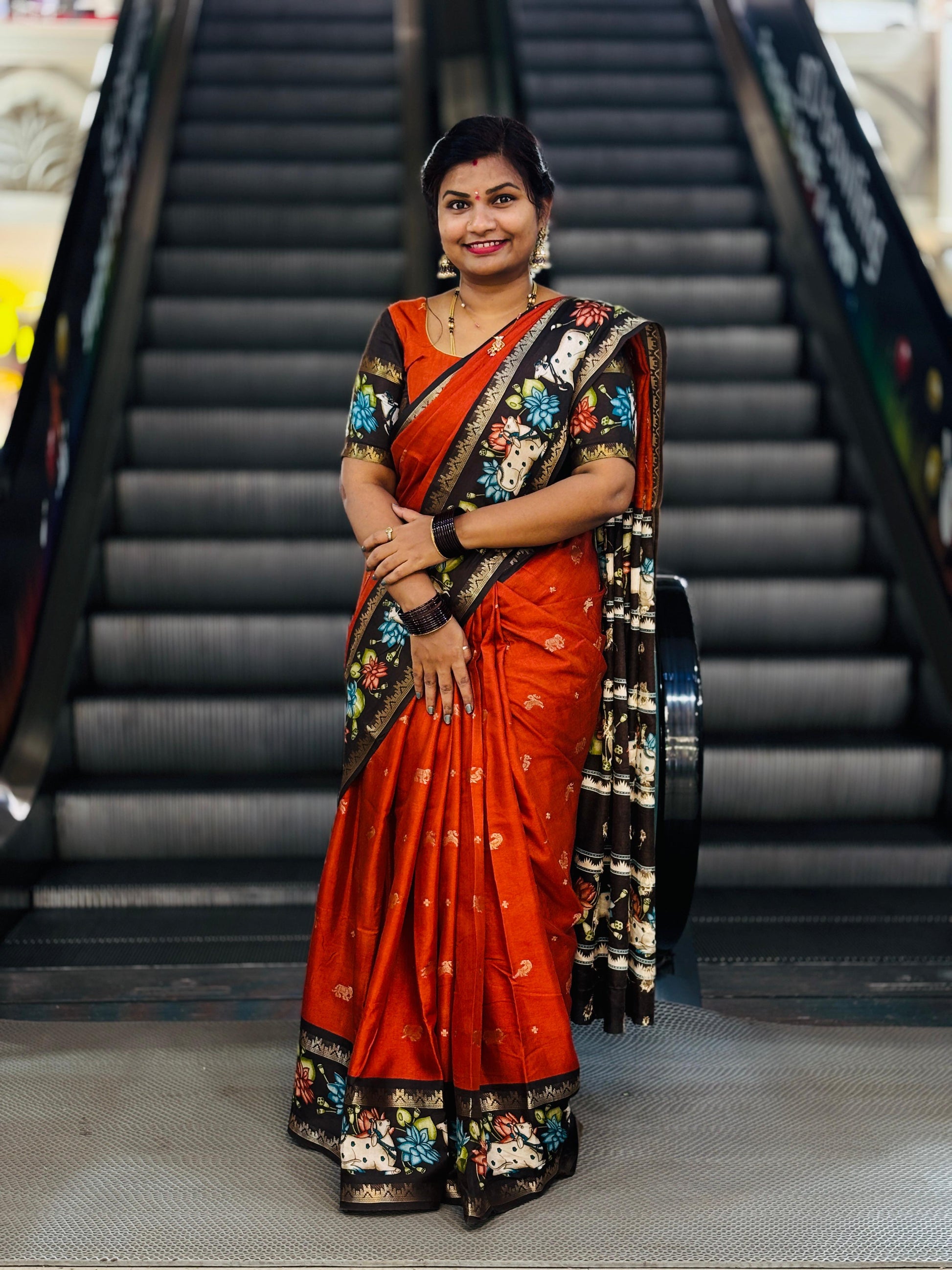 Rust Orange & Coffee Brown Mangalagiri Pichwai Pattu Saree – Trendy Festive Collection