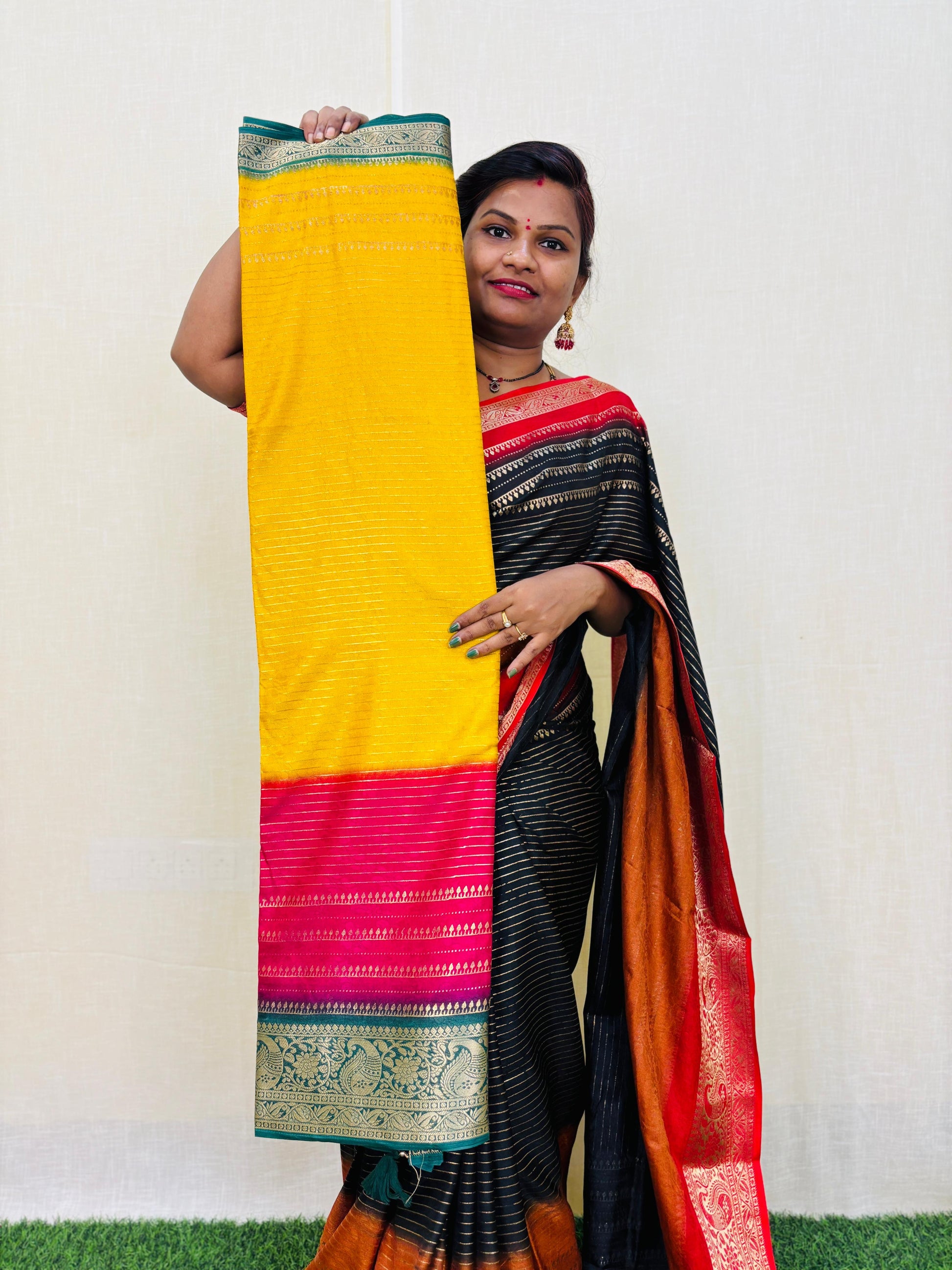 Expertly crafted from Semi Mysore Multi Crepe, these sarees are enhanced with a unique 2D Multi Border design. Elevate your style with its lightweight and comfortable fabric, making it perfect for any occasion. Exude elegance and grace with these versatile sarees.