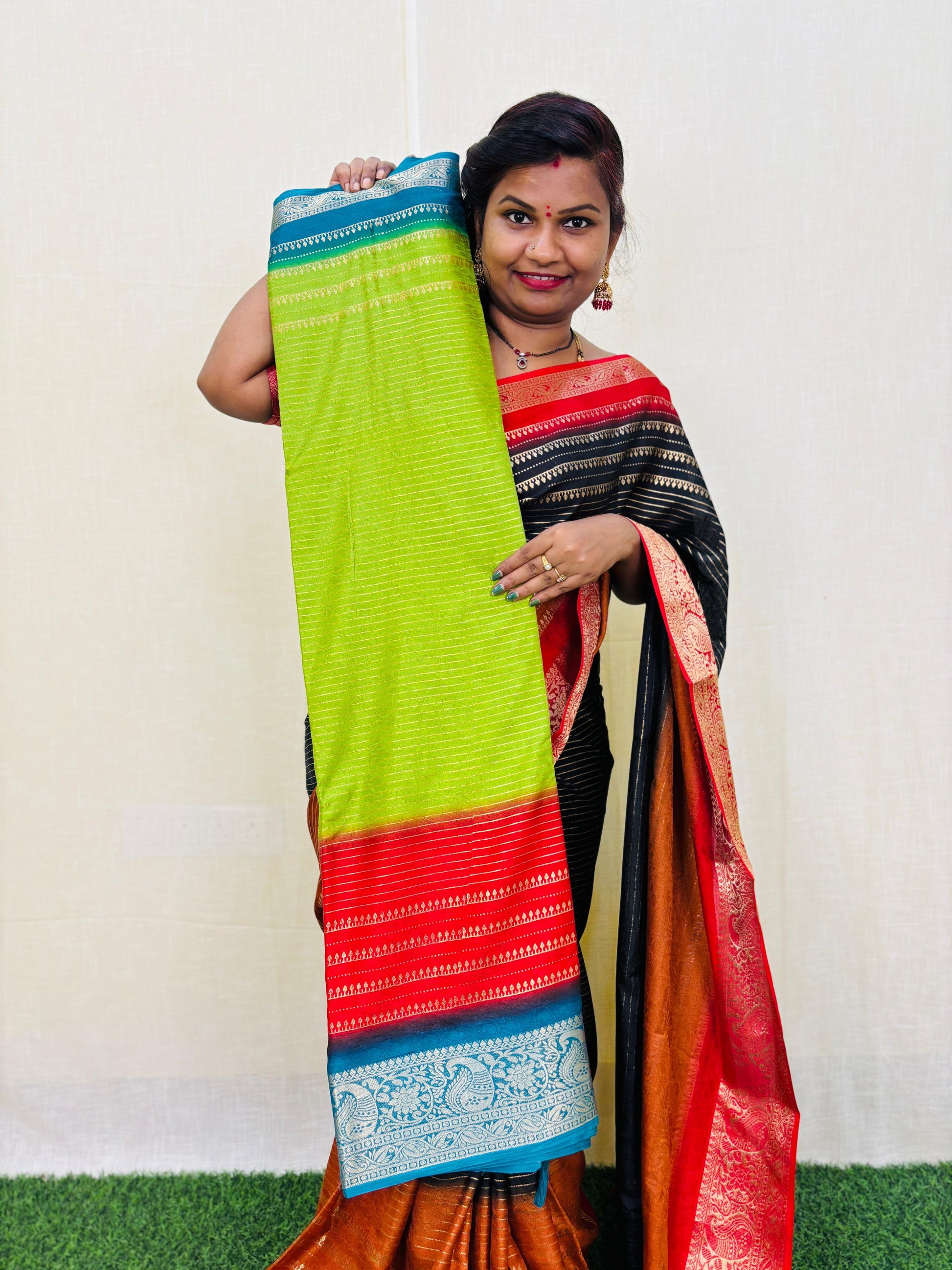 Expertly crafted from Semi Mysore Multi Crepe, these sarees are enhanced with a unique 2D Multi Border design. Elevate your style with its lightweight and comfortable fabric, making it perfect for any occasion. Exude elegance and grace with these versatile sarees.