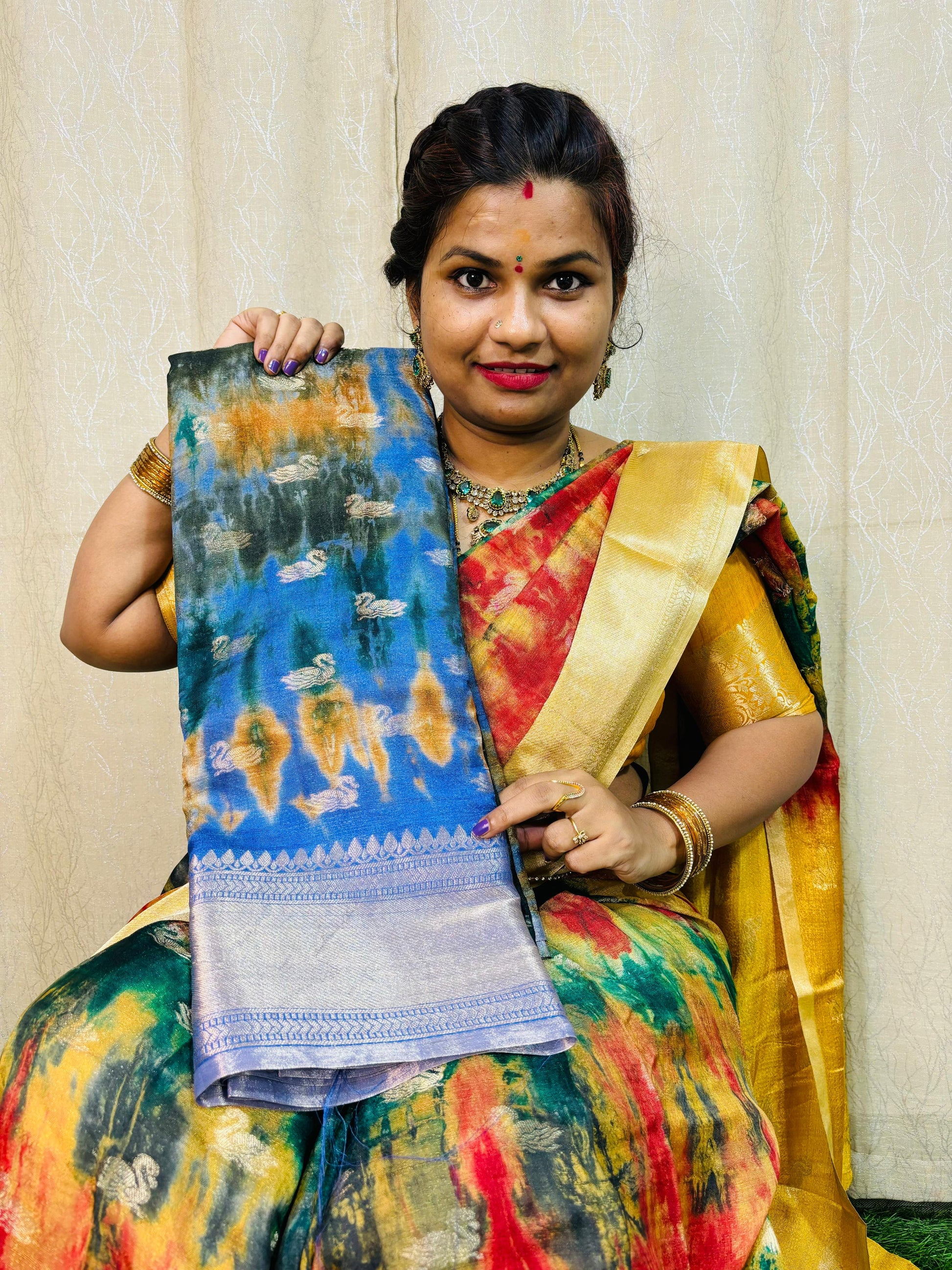 This expertly crafted Sibbori features striking Kanchi borders that beautifully contrast with the intricate butties blouse. Experience the traditional art of tie and die in a modern garment, perfect for any occasion. Elevate your style with this unique piece that seamlessly blends tradition and innovation.