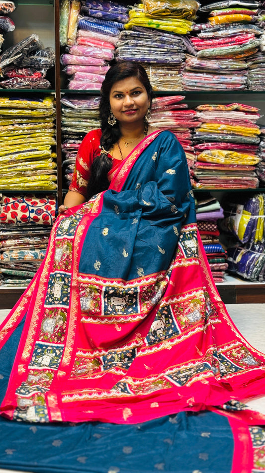 Mangalgiri Madhubani Pattu With contrast butti blouse And Kanchi weaving borders