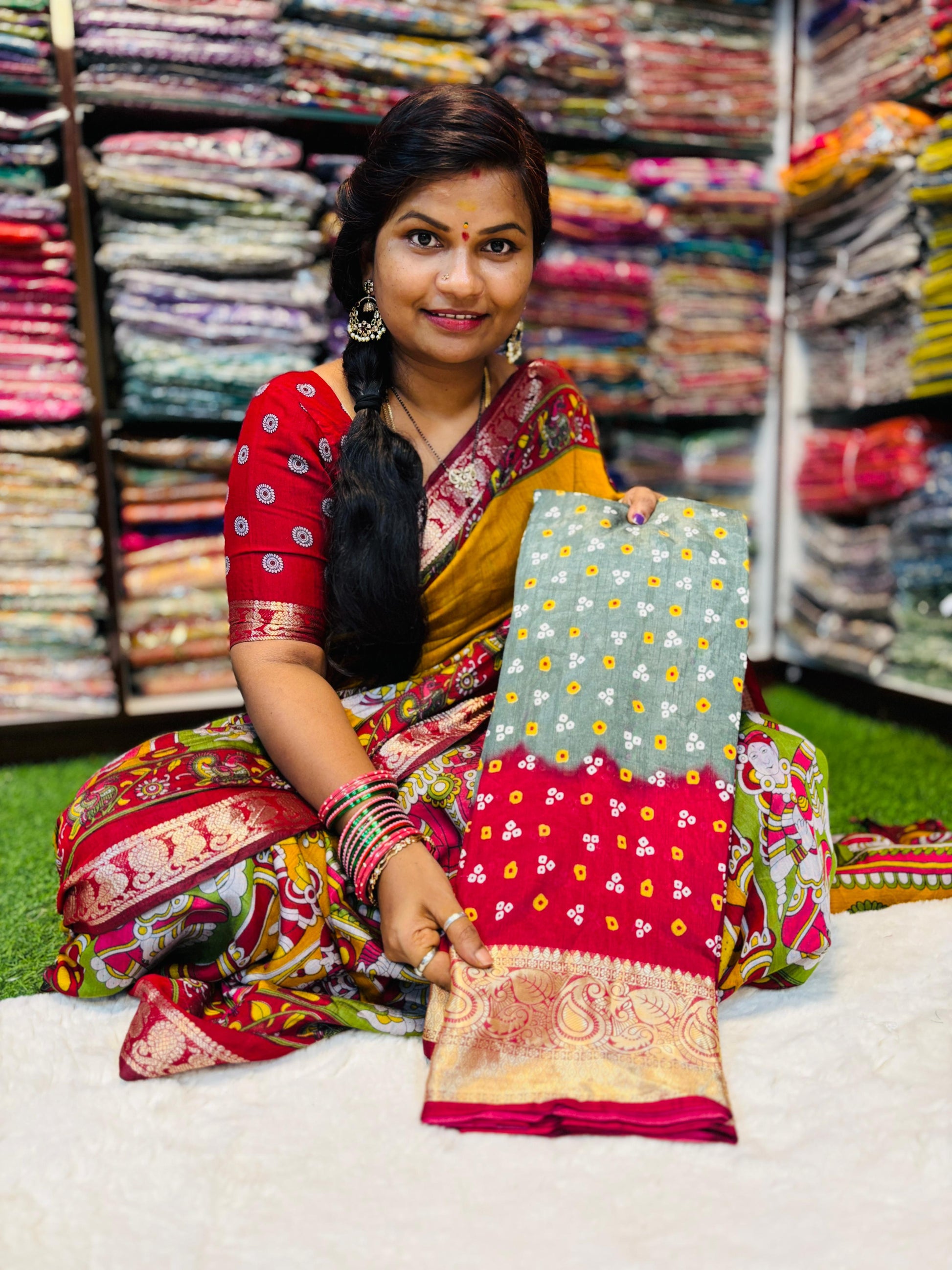 This 2D Bandini Silk saree features Kanchi weaving borders and a self blouse. Made from high-quality silk, it offers a luxurious and unique look. The contrast blouse adds a touch of elegance to this traditional attire. Perfect for any occasion, experience the beauty and comfort of 2D Bandini Silk.
