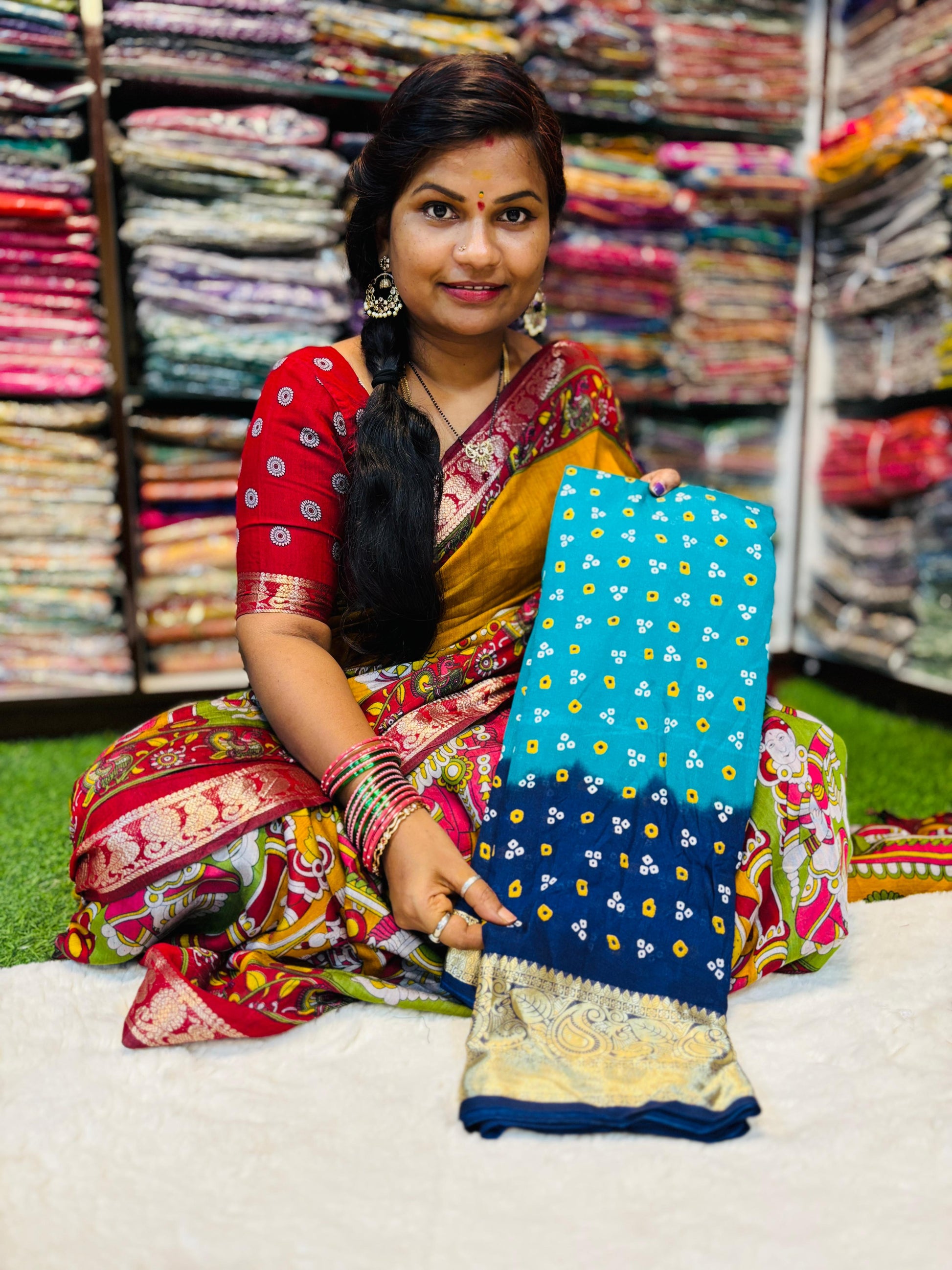 This 2D Bandini Silk saree features Kanchi weaving borders and a self blouse. Made from high-quality silk, it offers a luxurious and unique look. The contrast blouse adds a touch of elegance to this traditional attire. Perfect for any occasion, experience the beauty and comfort of 2D Bandini Silk.