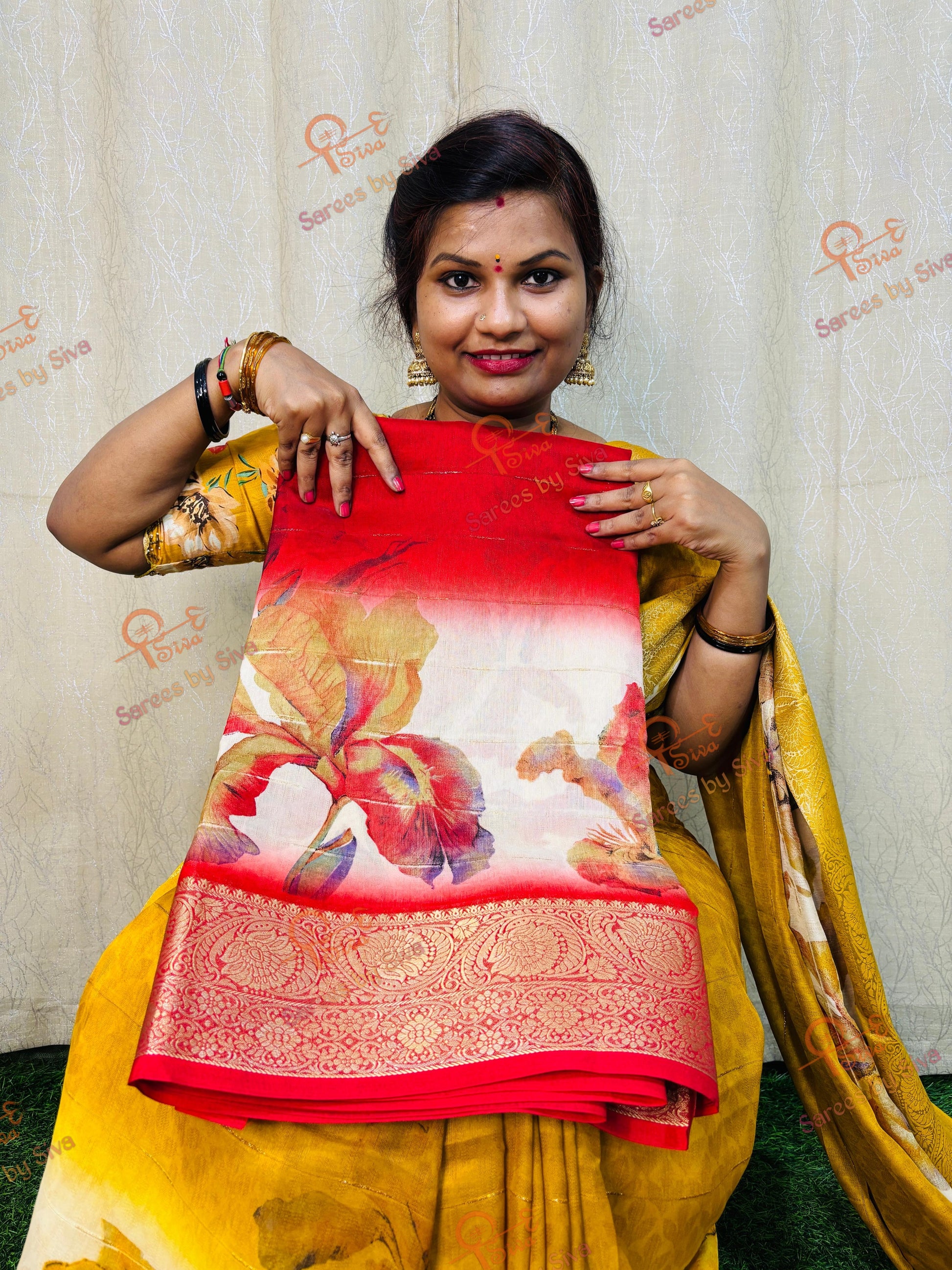 ప్రత్యేకమైన డిజైనర్ పూల ప్రింట్లను కలిగి ఉన్న మా 2D మాష్మెల్లో క్రేప్ సిల్క్ చీరతో మీ సాంప్రదాయ రూపాన్ని మెరుగుపరచుకోండి. విలాసవంతమైన సిల్క్ మెటీరియల్తో తయారు చేయబడిన ఈ చీర ఏ సందర్భానికైనా తప్పనిసరిగా ఉండాలి. ఇప్పుడే దీన్ని కేవలం 1199/-కి పొందండి మరియు మీరు ఎక్కడికి వెళ్లినా ఒక ప్రకటన చేయండి.