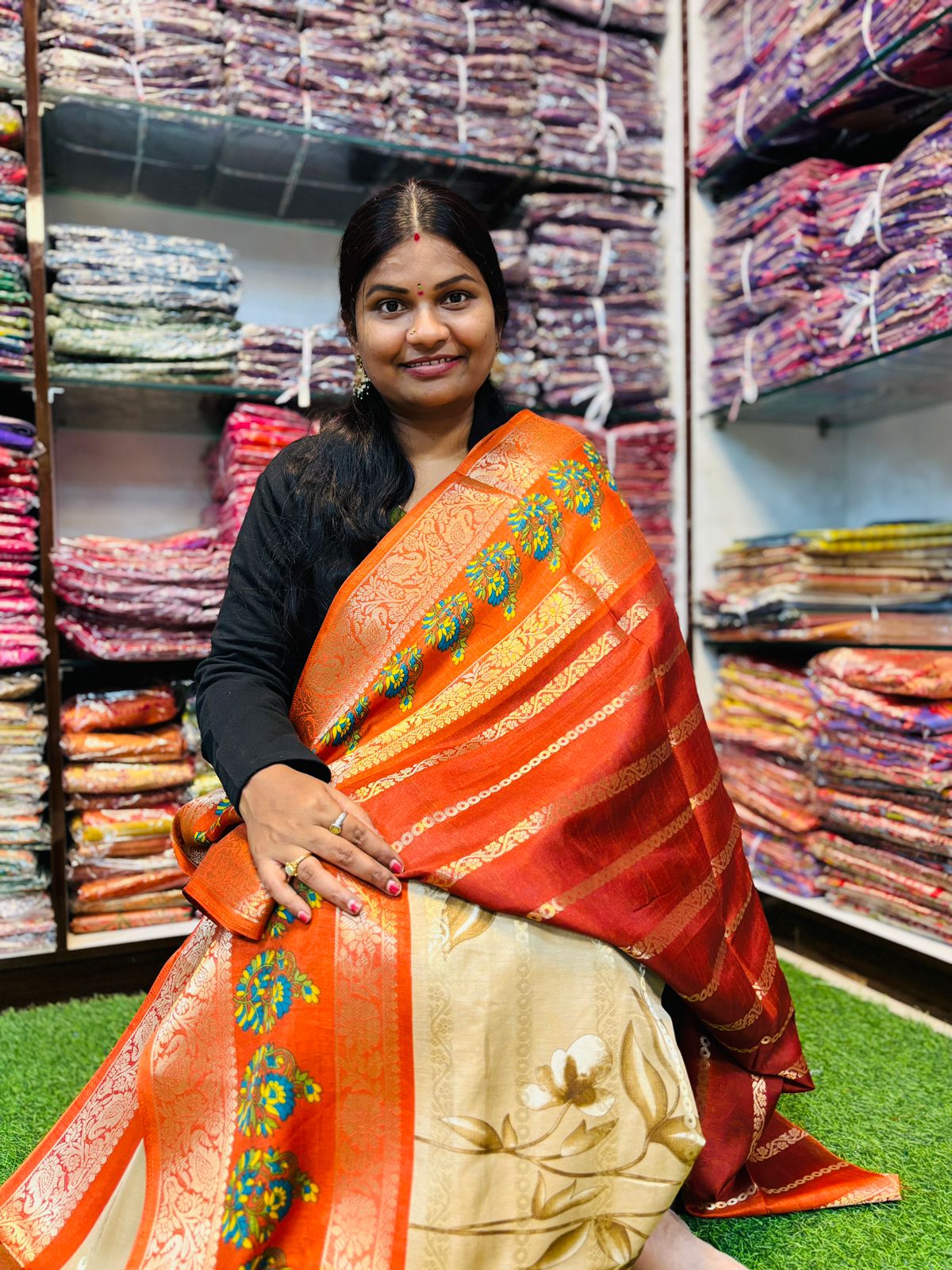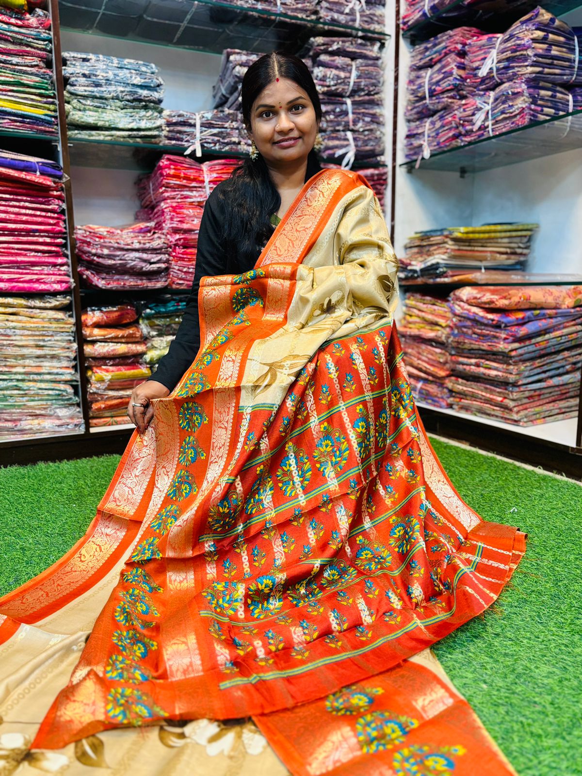 Discover the elegance and luxury of Banarasi Silk sarees. Made from the finest quality silk, these sarees feature a stunning contrast pallu with intricate zari weavings for a touch of opulence. The contrast blouse complements the saree perfectly while the Kalamkari floral print on the borders adds a unique touch. Experience the timeless beauty and craftsmanship of Banarasi Silk.