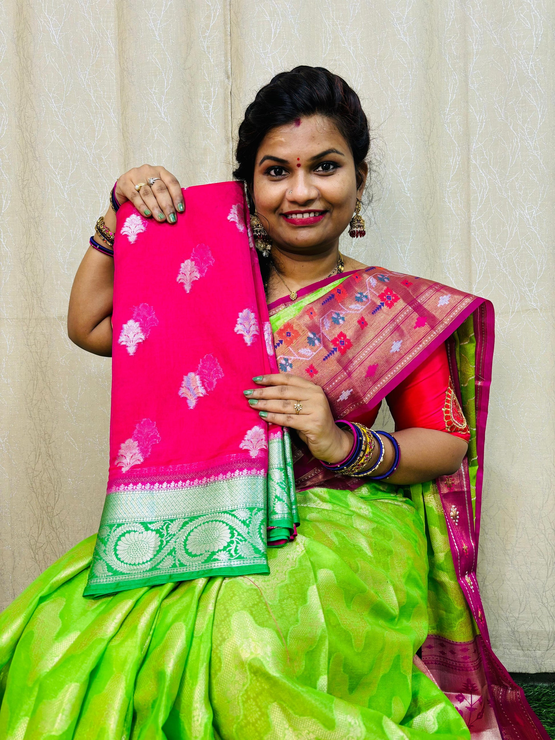మా బనారసీ వెచ్చని పట్టు చీరలతో విలాసవంతమైన వెచ్చదనం మరియు శైలిని అనుభవించండి. ప్రీమియం నాణ్యమైన బనారసీ ఫాబ్రిక్తో తయారు చేయబడిన, మా చీరలు అప్రయత్నంగా సొగసైనవిగా కనిపించేటప్పుడు మిమ్మల్ని హాయిగా మరియు సౌకర్యవంతంగా ఉంచుతాయి. సున్నితమైన హస్తకళ మరియు కలకాలం లేని డిజైన్తో, ఈ చీరలు ఏ ఫ్యాషన్-ఫార్వర్డ్ వార్డ్రోబ్కైనా తప్పనిసరిగా ఉండాలి.