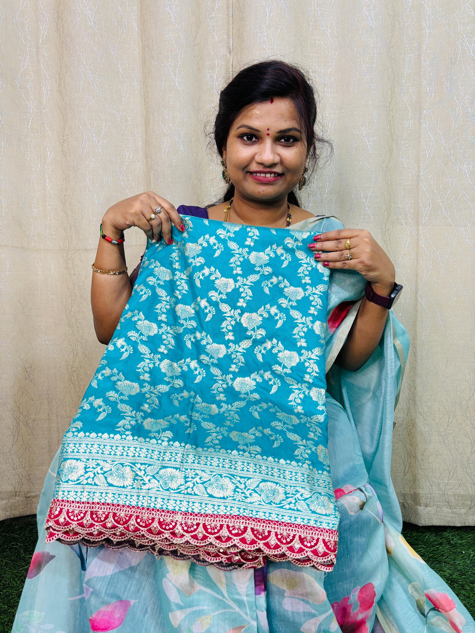 లేస్ బోర్డర్లు మరియు క్లిష్టమైన బట్టీస్ వర్క్తో బనారసి వీవింగ్ యొక్క విలాసవంతమైన చక్కదనాన్ని బ్లౌజ్పై అనుభవించండి. ఈ స్టేట్మెంట్ పీస్తో సంప్రదాయం మరియు అధునాతనతను జోడించండి. కేవలం 1199/- ధరకే లభించే ఇది మీ వార్డ్రోబ్కు తప్పనిసరిగా ఉండాలి.