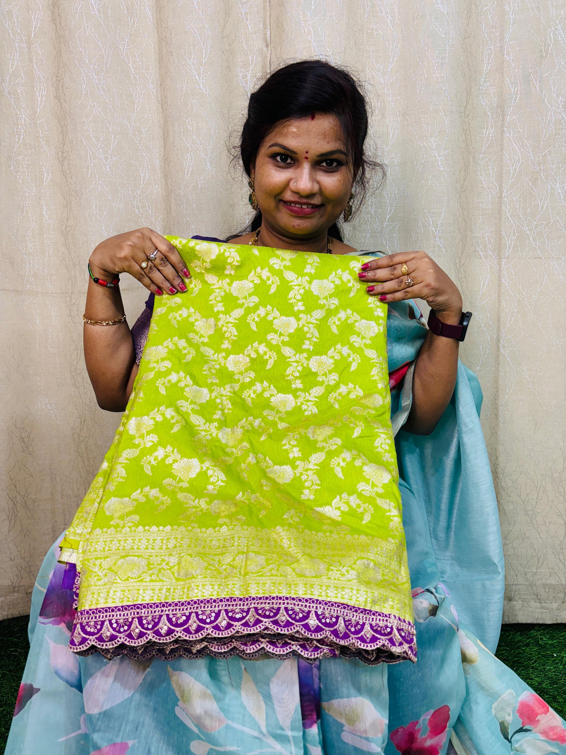 లేస్ బోర్డర్లు మరియు క్లిష్టమైన బట్టీస్ వర్క్తో బనారసి వీవింగ్ యొక్క విలాసవంతమైన చక్కదనాన్ని బ్లౌజ్పై అనుభవించండి. ఈ స్టేట్మెంట్ పీస్తో సంప్రదాయం మరియు అధునాతనతను జోడించండి. కేవలం 1199/- ధరకే లభించే ఇది మీ వార్డ్రోబ్కు తప్పనిసరిగా ఉండాలి.