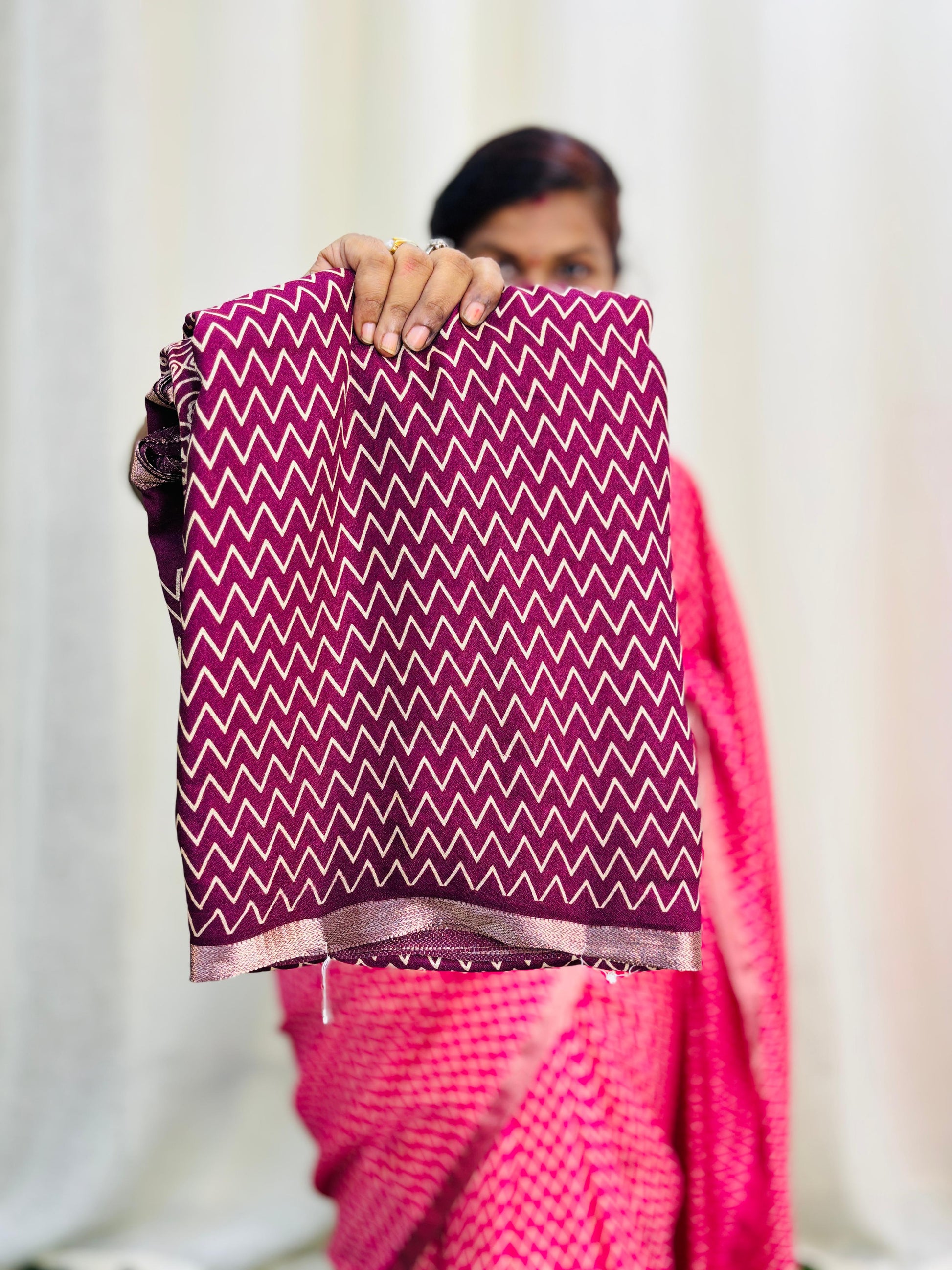 "Upgrade your wardrobe with our Kshatriya pattern Binny Crepe saree. Made with high-quality fabric, this saree is perfect for any occasion. Experience comfort and elegance at an affordable price of 1150."