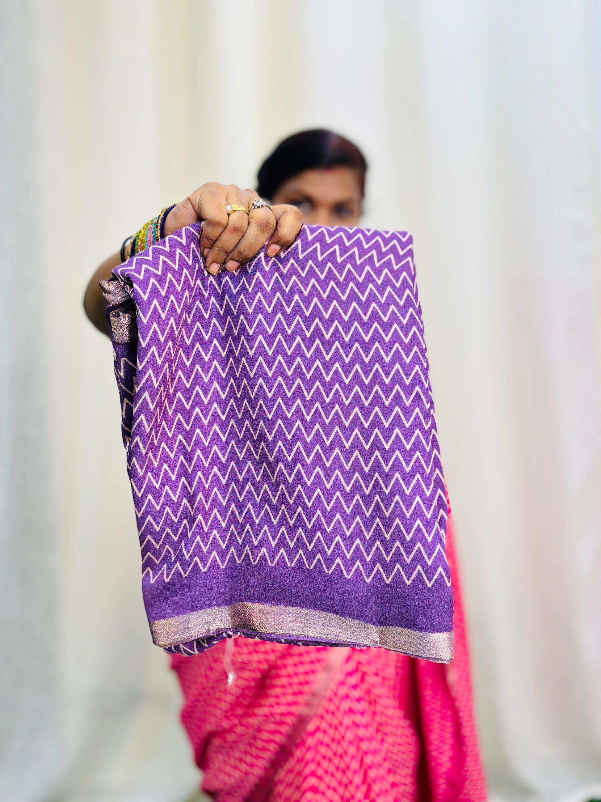 "Upgrade your wardrobe with our Kshatriya pattern Binny Crepe saree. Made with high-quality fabric, this saree is perfect for any occasion. Experience comfort and elegance at an affordable price of 1150."