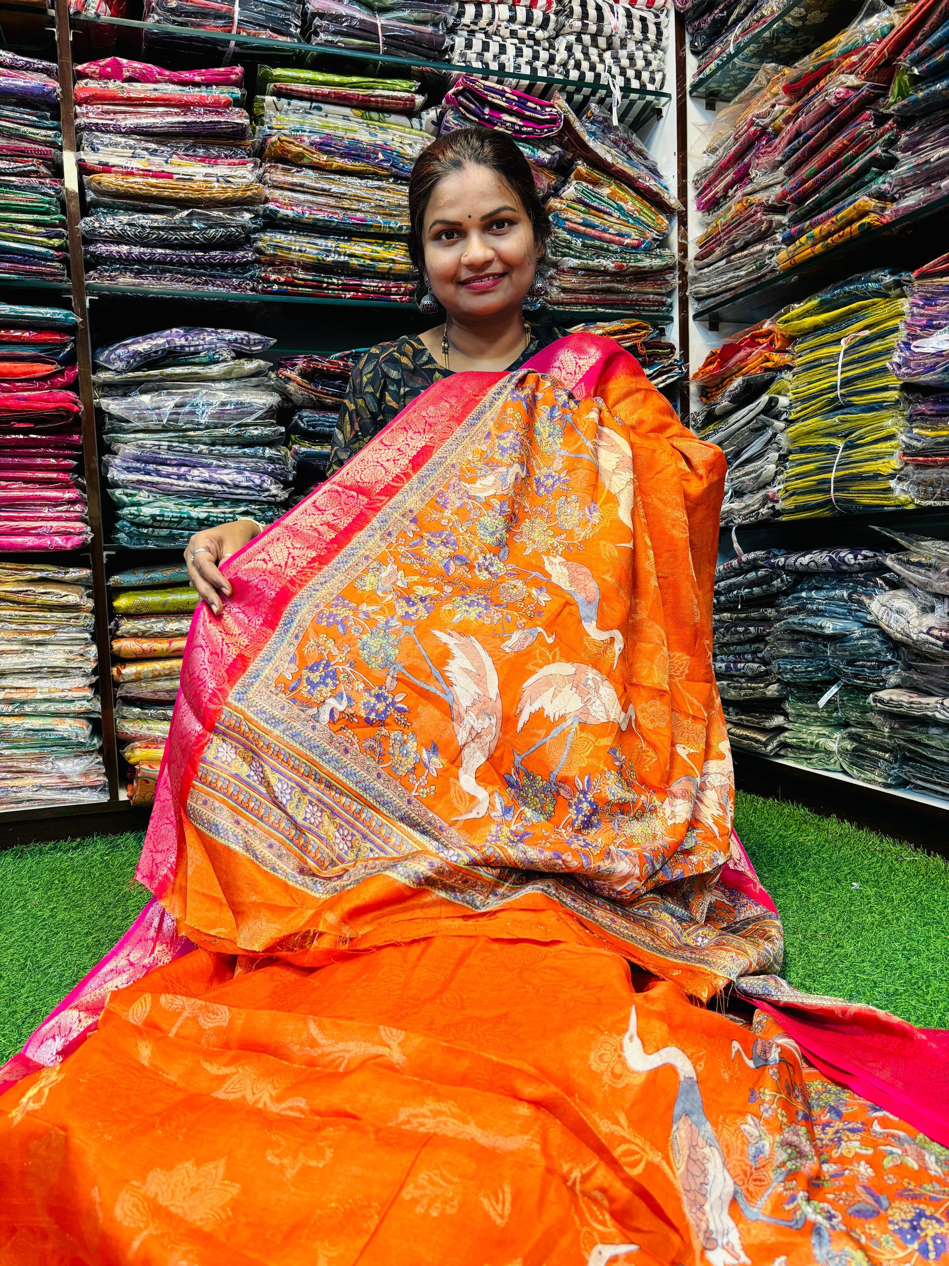 Enhance your wardrobe with our luxurious Crepe Silk. Featuring Allover Jacquard Weavings and Zari Weavings, this fabric boasts both elegance and durability. The unique Kalamkari print adds a touch of traditional charm. Upgrade your style game with this premium fabric, now only 750/-!