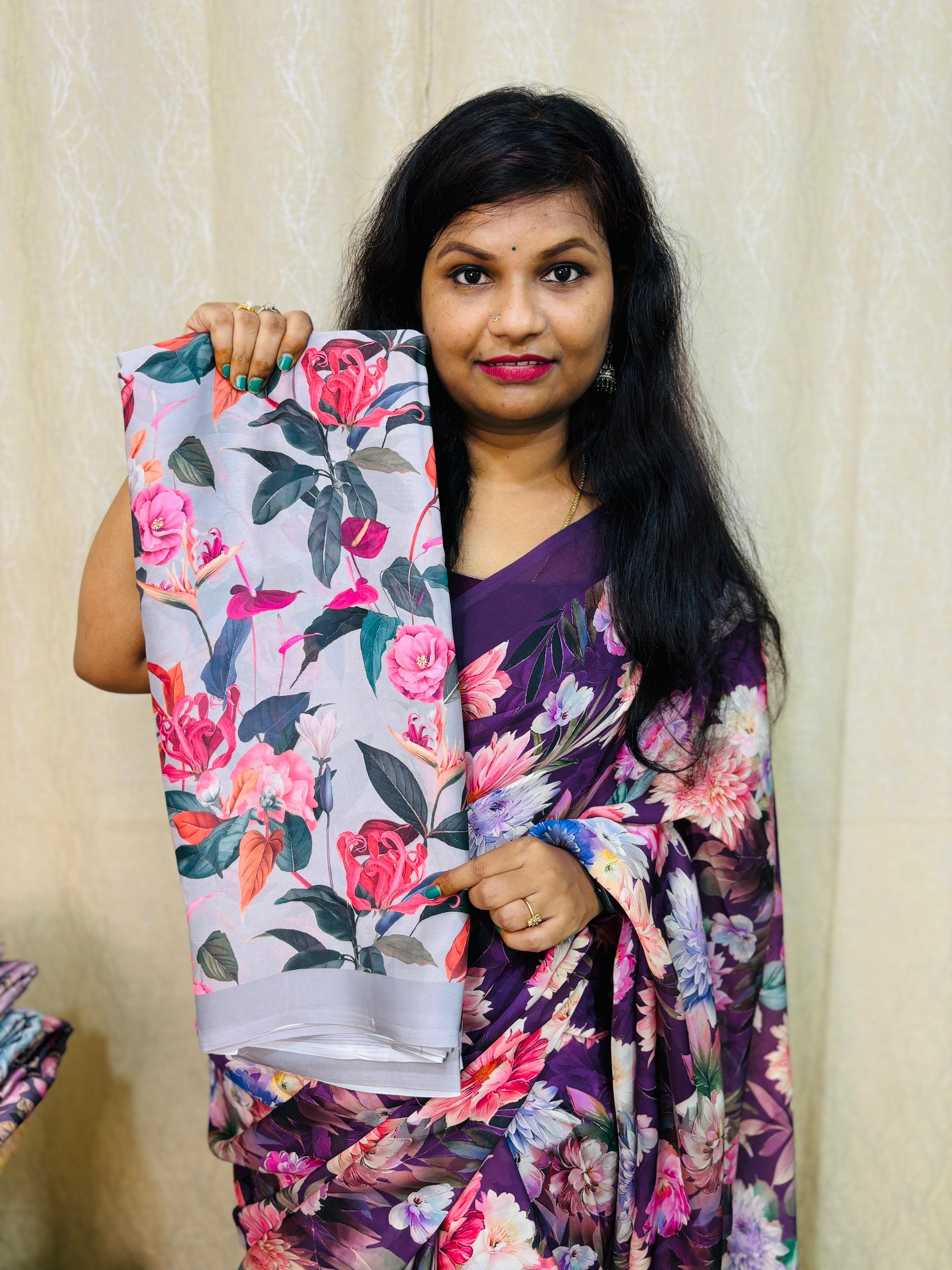 శాటిన్ సరిహద్దులతో మా డిజిటల్ శాటిన్ చిఫ్ఫోన్లను పరిచయం చేస్తున్నాము - లగ్జరీ మరియు సౌకర్యాల యొక్క ఖచ్చితమైన కలయిక. లైట్ వెయిట్ మెటీరియల్స్తో తయారు చేయబడిన, మా చిఫ్ఫోన్లు ప్రవహించడమే కాకుండా చక్కదనాన్ని అందిస్తాయి. ఈ బహుముఖ మరియు స్టైలిష్ ఫ్యాబ్రిక్లతో మీ వార్డ్రోబ్ను అప్గ్రేడ్ చేయండి.