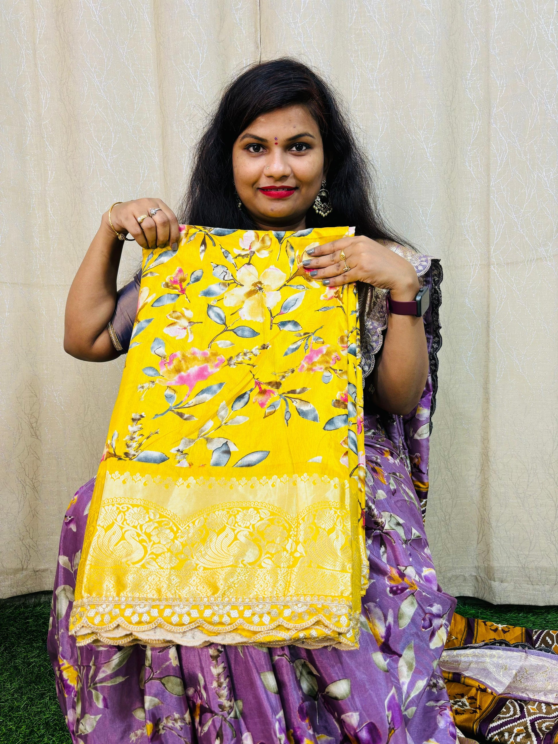ప్రీమియం డోలా క్రేప్ సున్నితమైన స్కాలోప్ బార్డర్ మరియు సొగసైన నెమలి జారీ వివరాలను కలిగి ఉన్న మా నైపుణ్యంతో రూపొందించిన డోలా క్రీప్ బ్లౌజ్తో మీ వార్డ్రోబ్ను అప్గ్రేడ్ చేస్తుంది. ప్రీమియం డోలా క్రేప్తో తయారు చేయబడింది మరియు అద్భుతమైన కాంట్రాస్ట్ ఇక్కత్ పల్లుతో పూర్తి చేయబడింది, ఈ బ్లౌజ్ ఏదైనా దుస్తులను ఎలివేట్ చేస్తుంది. శైలి, విశ్వాసం మరియు నాణ్యతతో నిలబడండి.