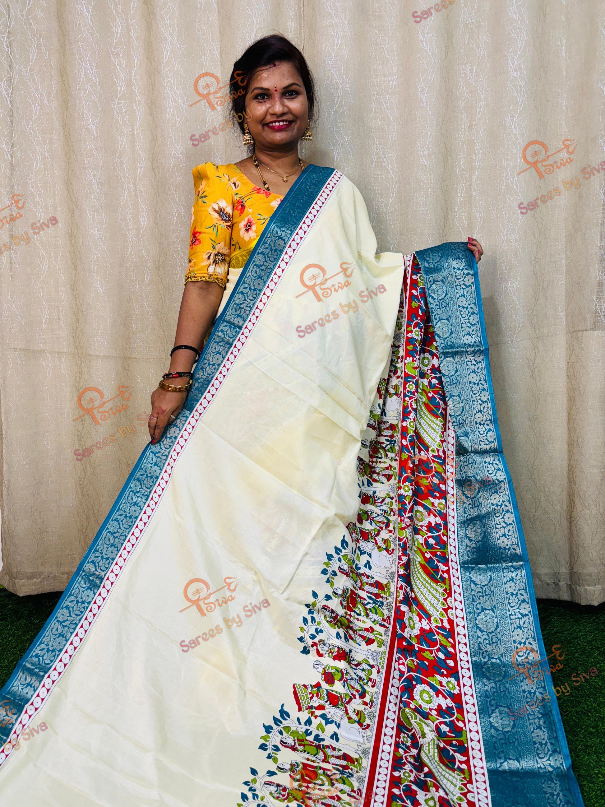 ప్రీమియం డోలా కలంకారి ప్రింట్లు మరియు క్లిష్టమైన కాంట్రాస్ట్ కంచి నేత సరిహద్దులతో నిపుణులతో రూపొందించబడిన ఈ ఉత్పత్తి చక్కదనం మరియు అధునాతనతను వెదజల్లుతుంది. వివరణాత్మక డిజైన్లు మరియు అధిక-నాణ్యత బట్టలు మీ శైలిని మెరుగుపరుస్తాయి. కేవలం 540/-కి అందుబాటులో ఉంది, ఇది ఫ్యాషన్-ఫార్వర్డ్ వ్యక్తికి తప్పనిసరిగా ఉండాలి.