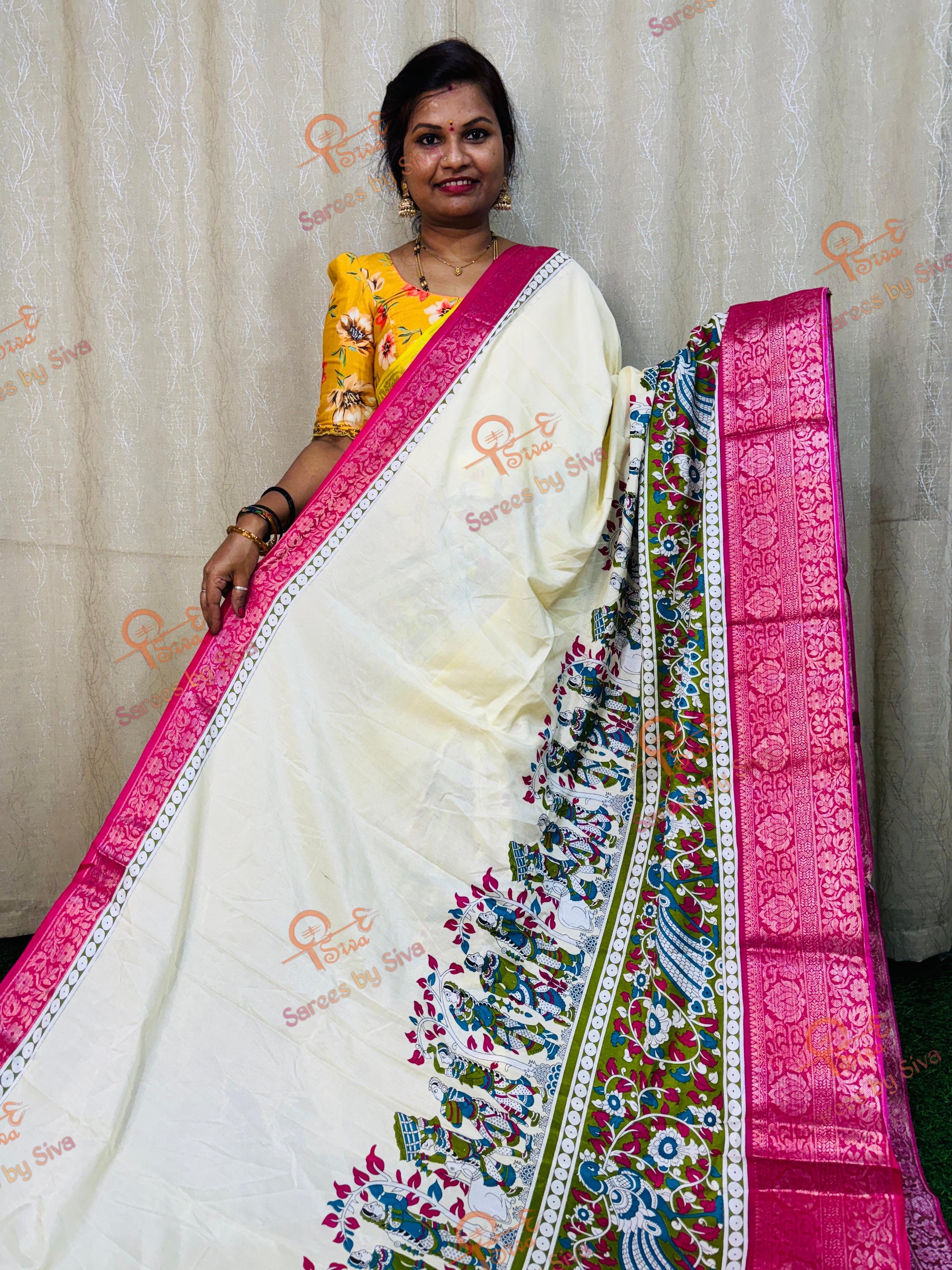 ప్రీమియం డోలా కలంకారి ప్రింట్లు మరియు క్లిష్టమైన కాంట్రాస్ట్ కంచి నేత సరిహద్దులతో నిపుణులతో రూపొందించబడిన ఈ ఉత్పత్తి చక్కదనం మరియు అధునాతనతను వెదజల్లుతుంది. వివరణాత్మక డిజైన్లు మరియు అధిక-నాణ్యత బట్టలు మీ శైలిని మెరుగుపరుస్తాయి. కేవలం 540/-కి అందుబాటులో ఉంది, ఇది ఫ్యాషన్-ఫార్వర్డ్ వ్యక్తికి తప్పనిసరిగా ఉండాలి.