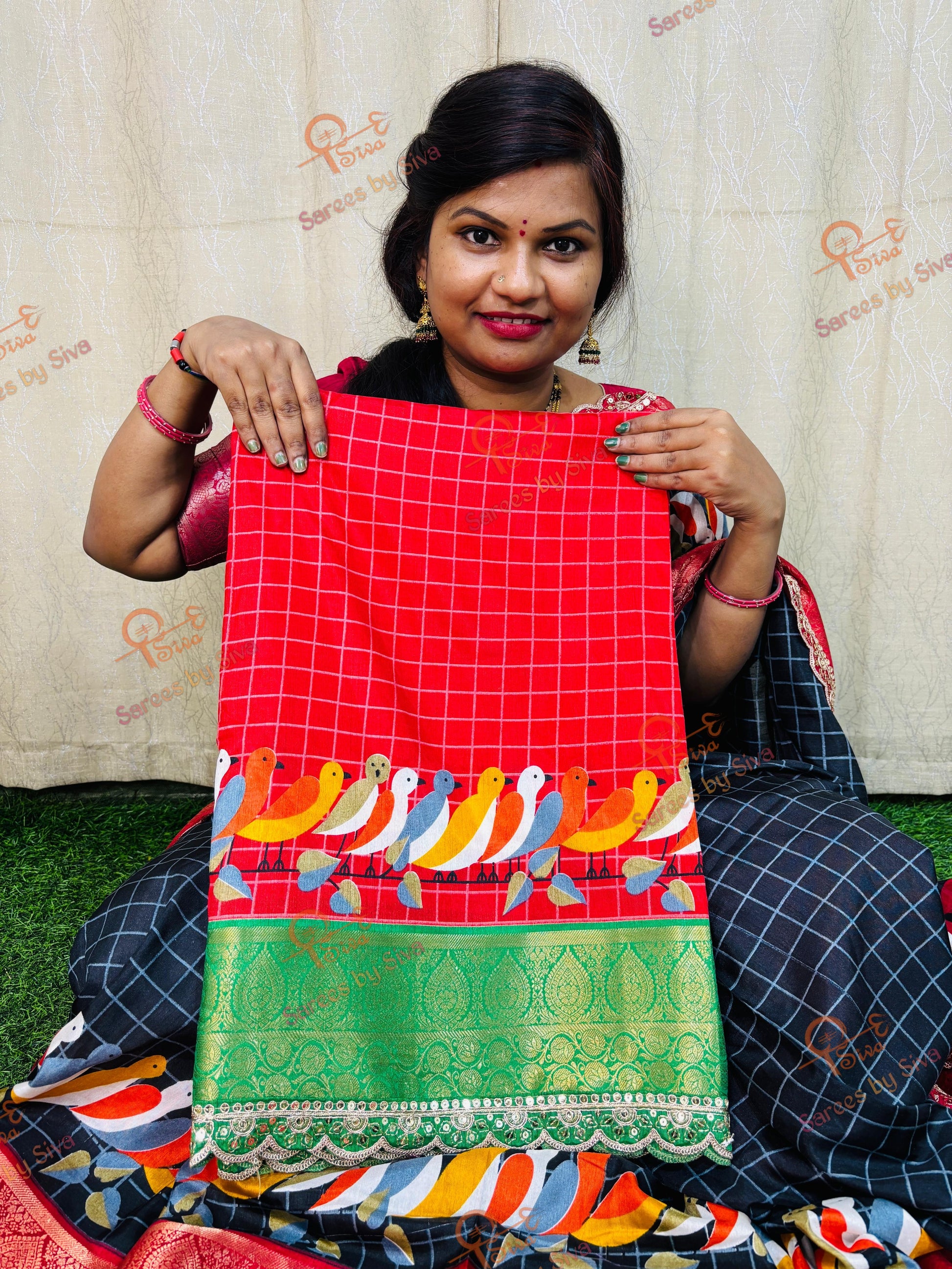 విలక్షణమైన పారట్స్ డిజైన్తో నైపుణ్యంగా రూపొందించబడిన ఈ బ్లౌజ్, క్లిష్టమైన డోలా కాంచి నేతను హైలైట్ చేసే అద్భుతమైన కాంట్రాస్ట్ను కలిగి ఉంది. సున్నితమైన స్కాలోప్ బార్డర్లు ఏ సందర్భానికైనా ప్రత్యేకమైన మరియు స్టైలిష్ ముక్కను సృష్టిస్తాయి. ఖచ్చితత్వం మరియు వివరాలకు శ్రద్ధతో తయారు చేయబడిన ఈ బ్లౌజ్, ఫ్యాషన్పై ఆసక్తి ఉన్న ఏ వ్యక్తికైనా తప్పనిసరిగా ఉండాలి.