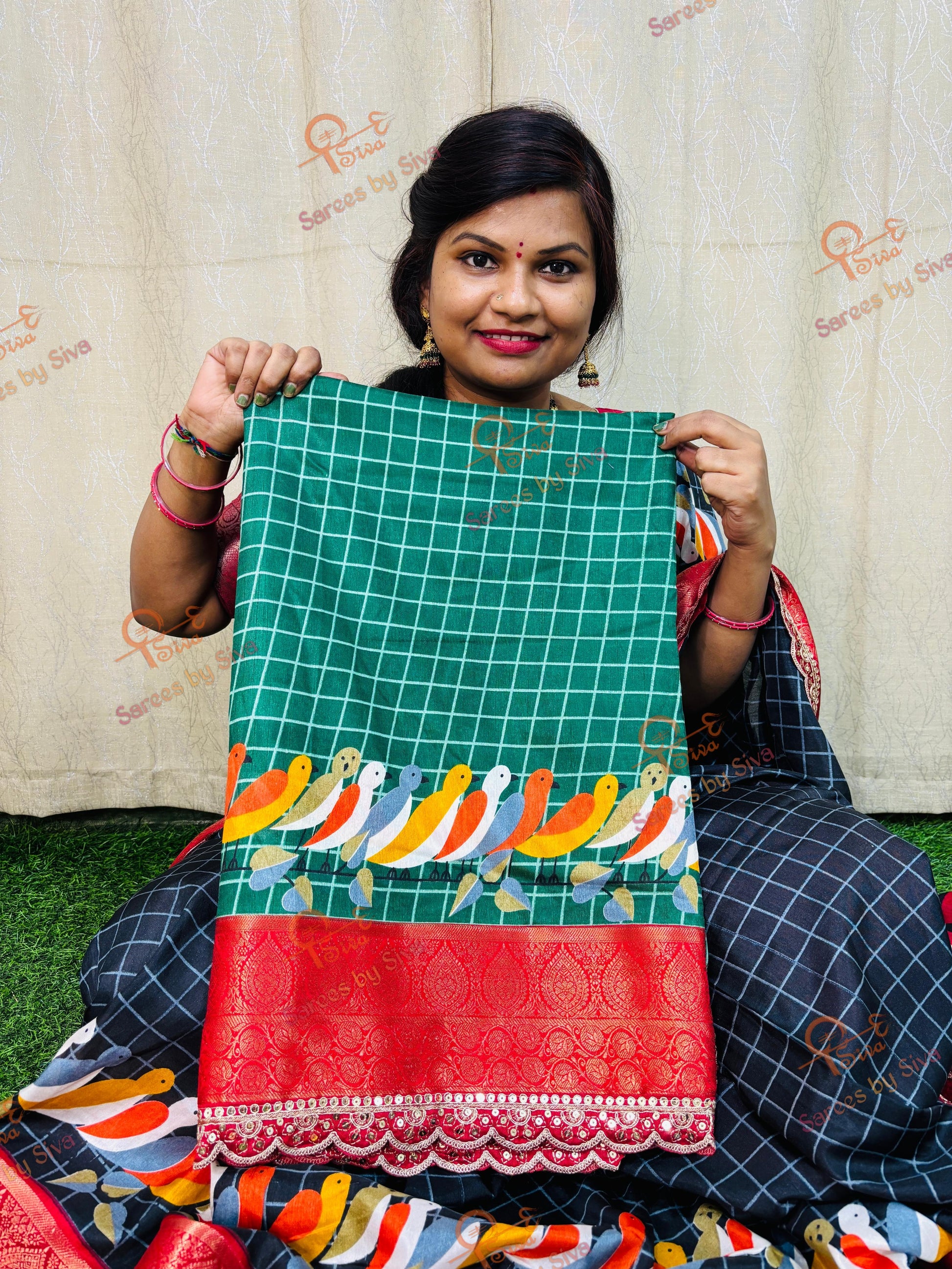 విలక్షణమైన పారట్స్ డిజైన్తో నైపుణ్యంగా రూపొందించబడిన ఈ బ్లౌజ్, క్లిష్టమైన డోలా కాంచి నేతను హైలైట్ చేసే అద్భుతమైన కాంట్రాస్ట్ను కలిగి ఉంది. సున్నితమైన స్కాలోప్ బార్డర్లు ఏ సందర్భానికైనా ప్రత్యేకమైన మరియు స్టైలిష్ ముక్కను సృష్టిస్తాయి. ఖచ్చితత్వం మరియు వివరాలకు శ్రద్ధతో తయారు చేయబడిన ఈ బ్లౌజ్, ఫ్యాషన్పై ఆసక్తి ఉన్న ఏ వ్యక్తికైనా తప్పనిసరిగా ఉండాలి.