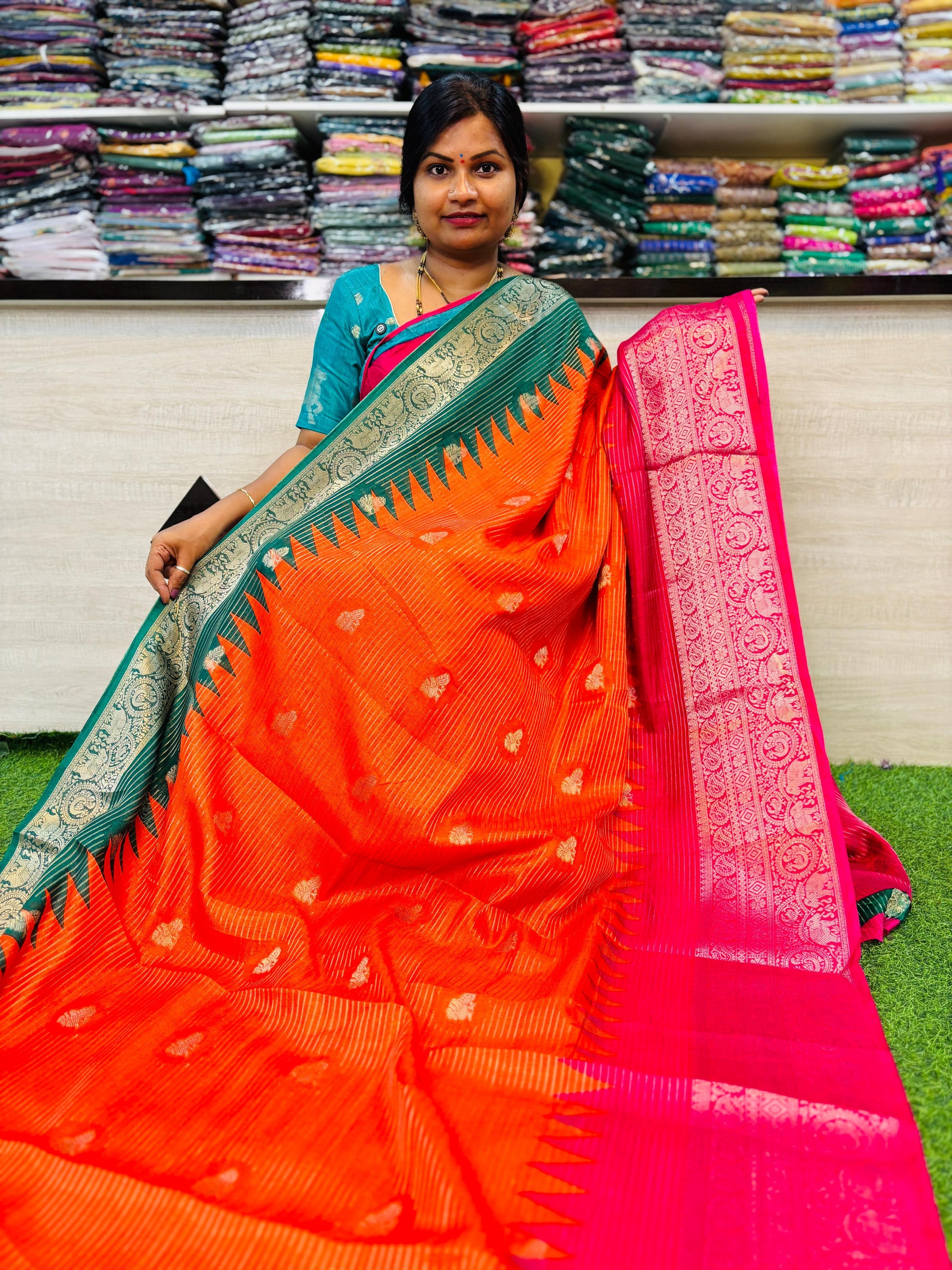 Experience the traditional craftsmanship with our Ganga Jamuna Borders. The intricate temple print border and rich pallu add a touch of elegance to your attire. Immerse yourself in the beauty of allover deer weaving butties, perfect for any occasion.