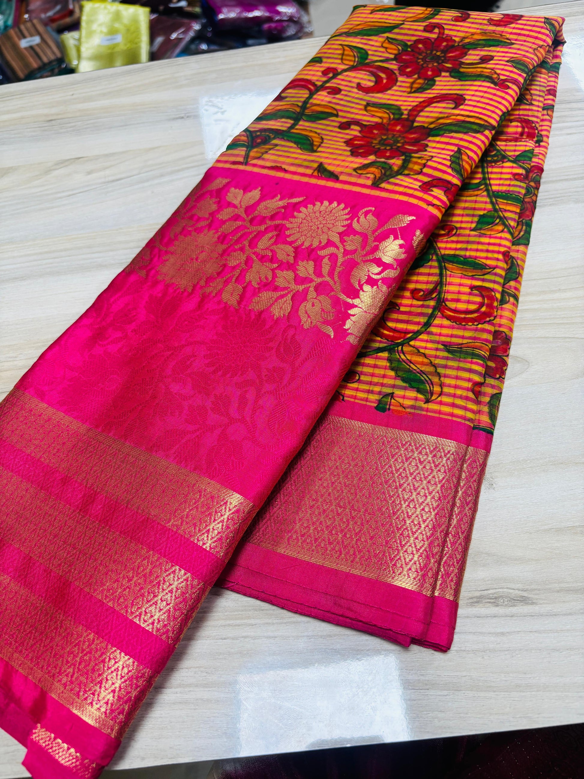 Kora Organza Checks Sarees feature a unique blend of traditional and modern design elements. The use of digital Kalamkari floral contrast border adds a touch of elegance and sophistication. Made from high-quality materials, these sarees offer both comfort and style for any occasion.