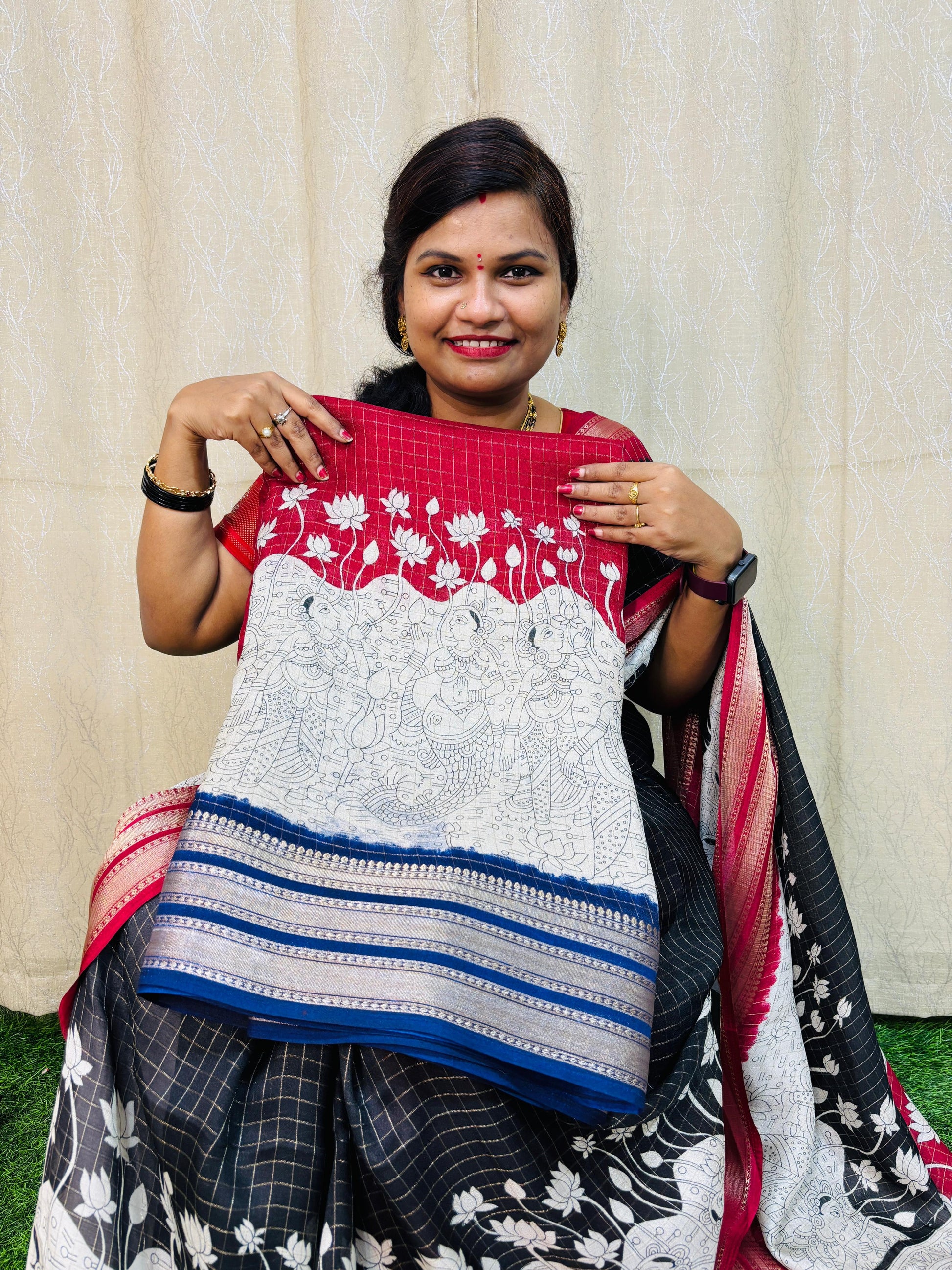 ఈ అద్భుతమైన లెనిన్ కంచిలో క్లిష్టమైన కలంకారి రూపురేఖలు మరియు కాంట్రాస్ట్ బ్లౌజ్ ఉన్నాయి. 2D బోర్డర్ల అందంలో మరియు కంచి నేత యొక్క సాంప్రదాయ కళలో మునిగిపోండి. శైలి మరియు సంస్కృతిని సజావుగా మిళితం చేసే ఈ నైపుణ్యంగా రూపొందించిన ముక్కతో మీ వార్డ్రోబ్ను ఉన్నత స్థాయికి తీసుకెళ్లండి.