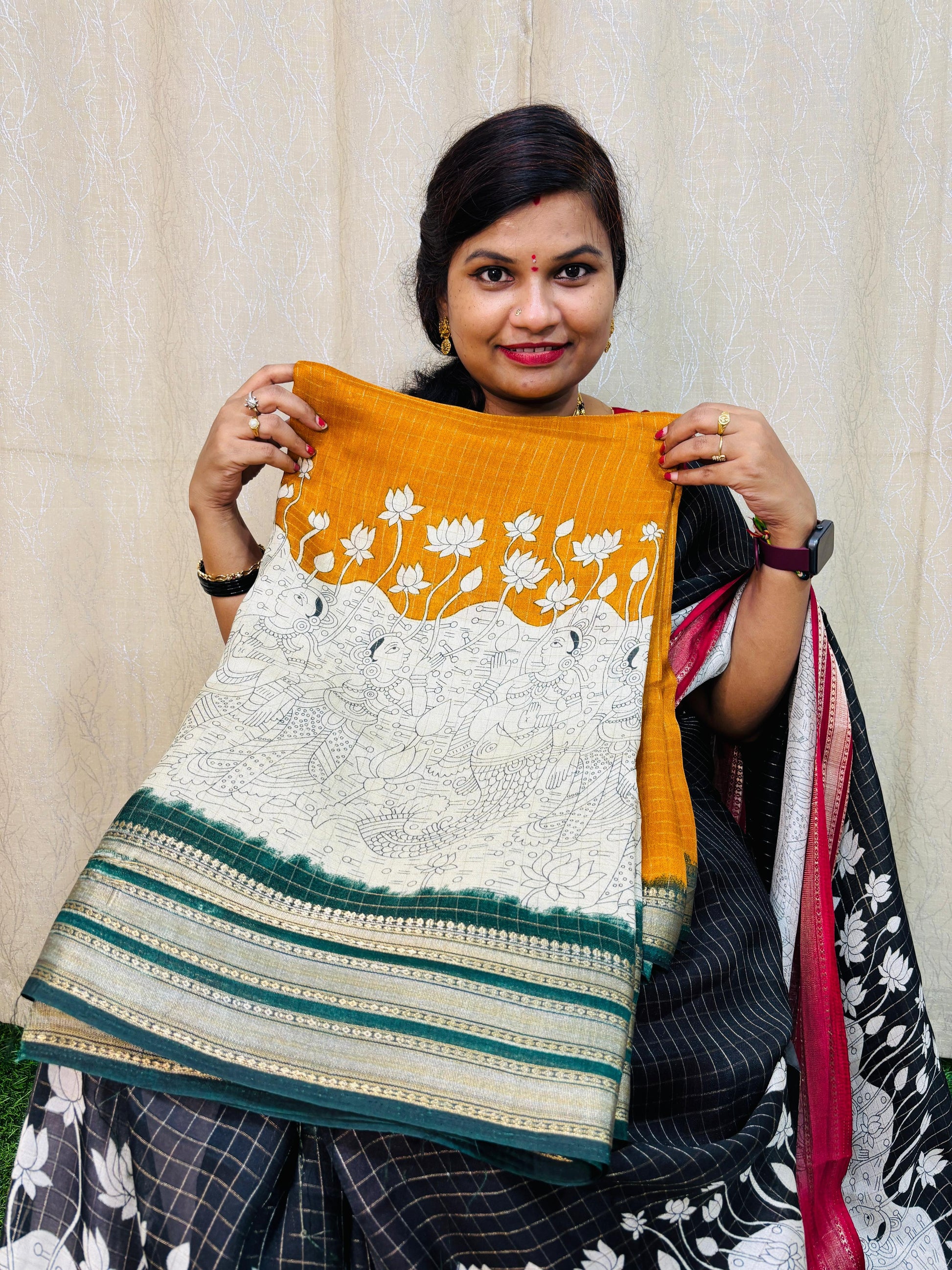 ఈ అద్భుతమైన లెనిన్ కంచిలో క్లిష్టమైన కలంకారి రూపురేఖలు మరియు కాంట్రాస్ట్ బ్లౌజ్ ఉన్నాయి. 2D బోర్డర్ల అందంలో మరియు కంచి నేత యొక్క సాంప్రదాయ కళలో మునిగిపోండి. శైలి మరియు సంస్కృతిని సజావుగా మిళితం చేసే ఈ నైపుణ్యంగా రూపొందించిన ముక్కతో మీ వార్డ్రోబ్ను ఉన్నత స్థాయికి తీసుకెళ్లండి.
