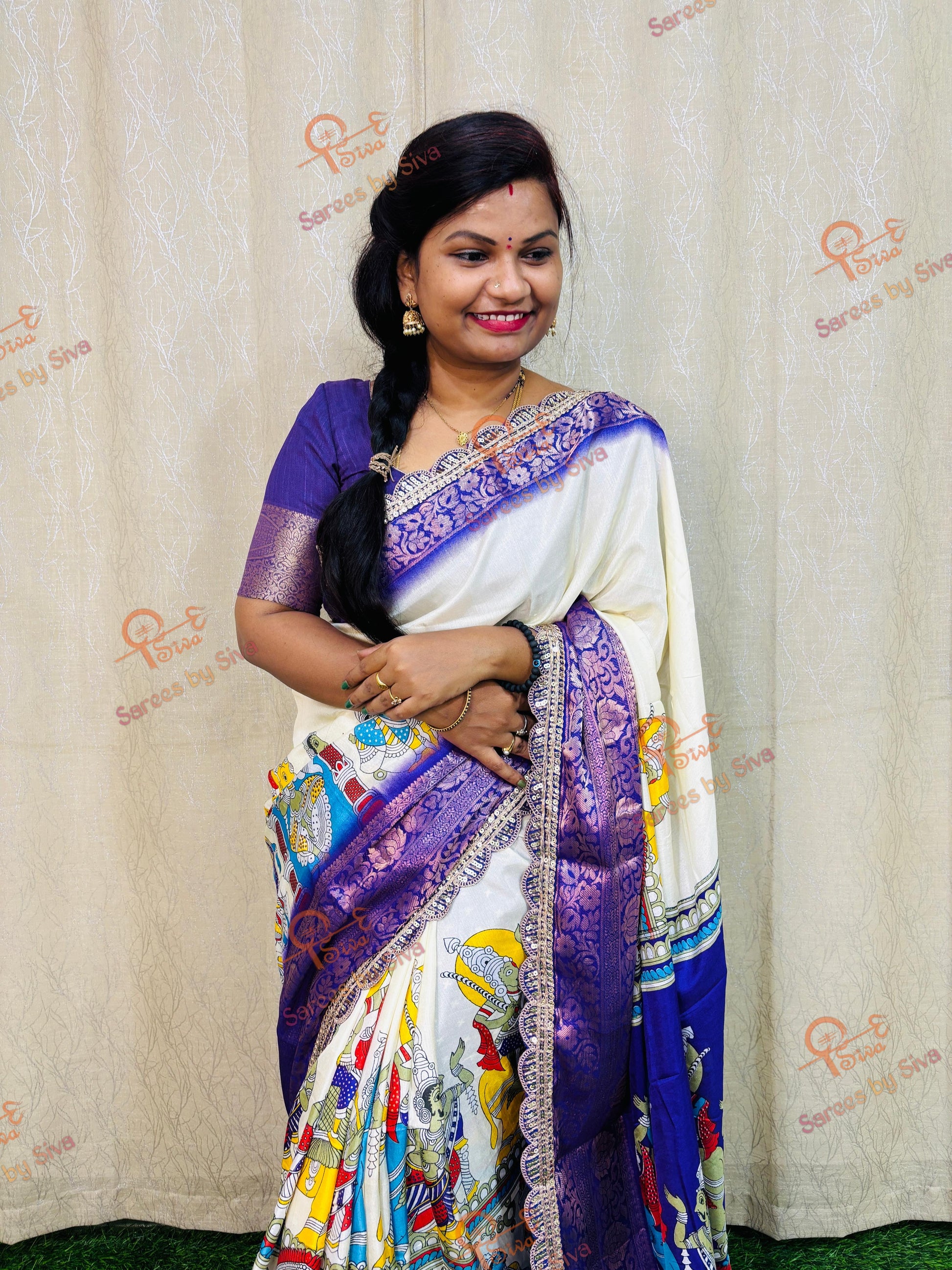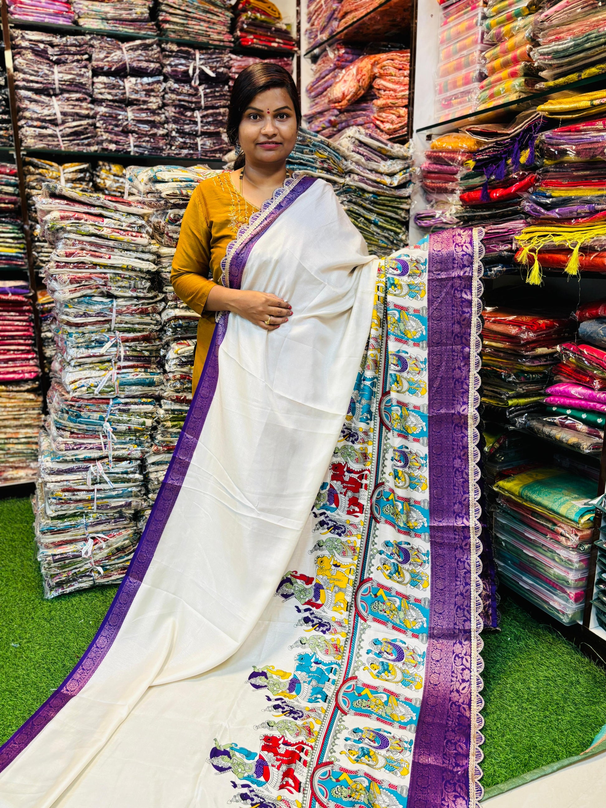 నైపుణ్యంగా రూపొందించబడిన మధుబని డోలా చీరలో కాంట్రాస్ట్ బ్లౌజ్ మరియు ప్రత్యేకమైన స్కాలోప్ బార్డర్లు ఉన్నాయి. ఈ సాంప్రదాయ చీరలు సంక్లిష్టమైన మధుబని కళను ప్రదర్శిస్తాయి, మీ వార్డ్రోబ్కు సంస్కృతి మరియు చక్కదనాన్ని జోడిస్తాయి. ఖచ్చితత్వంతో చేతితో నేసిన ప్రతి చీర ఒక కళాఖండం, ఏ సందర్భానికైనా సరైనది.