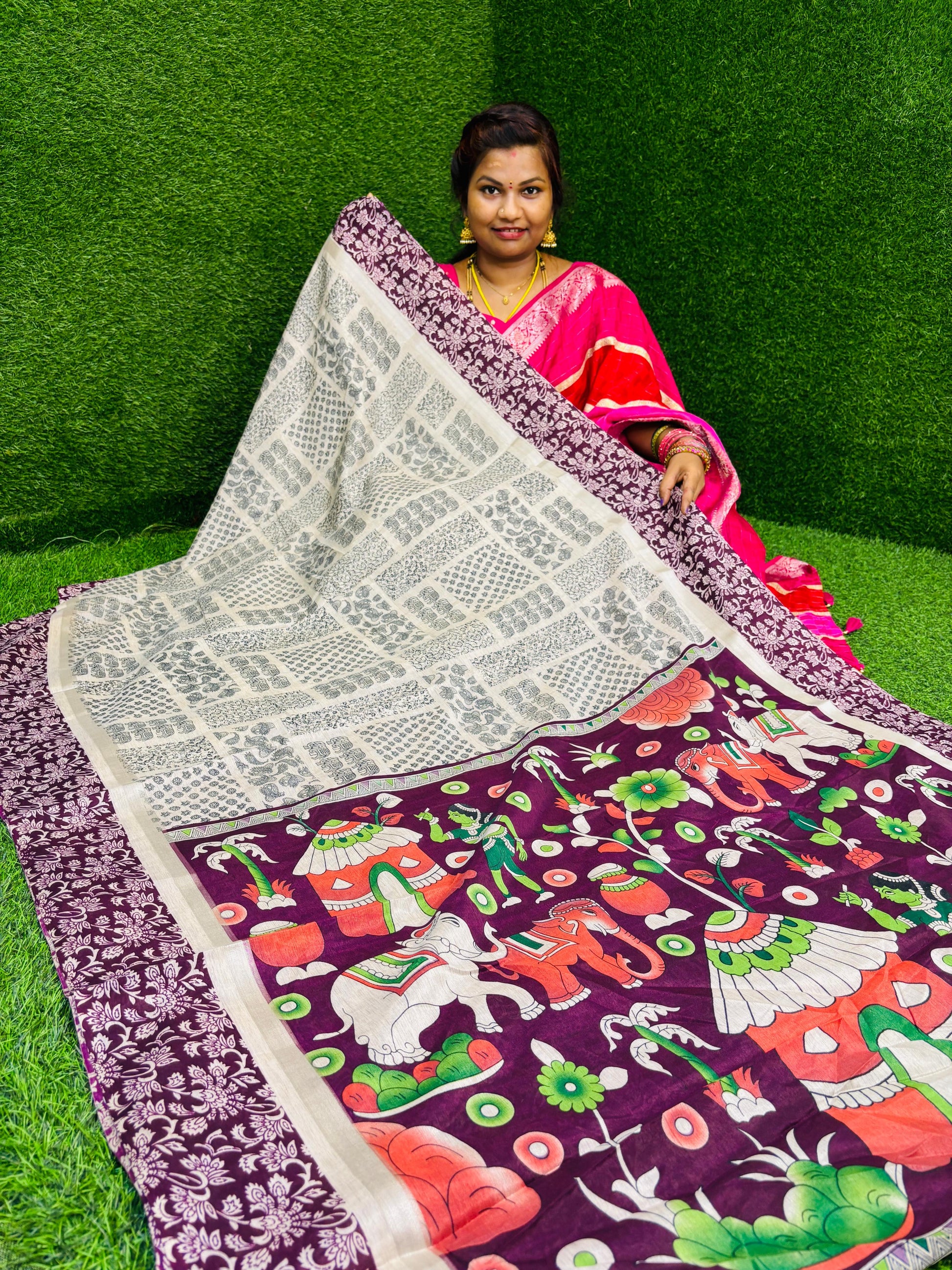 Add a touch of traditional elegance to your wardrobe with our Madhubani Kalamkari Silk saree featuring intricate hand-printed borders. Made from luxurious silk, this saree is perfect for any special occasion. Elevate your style and make a statement with our masterpiece, crafted with care and precision.