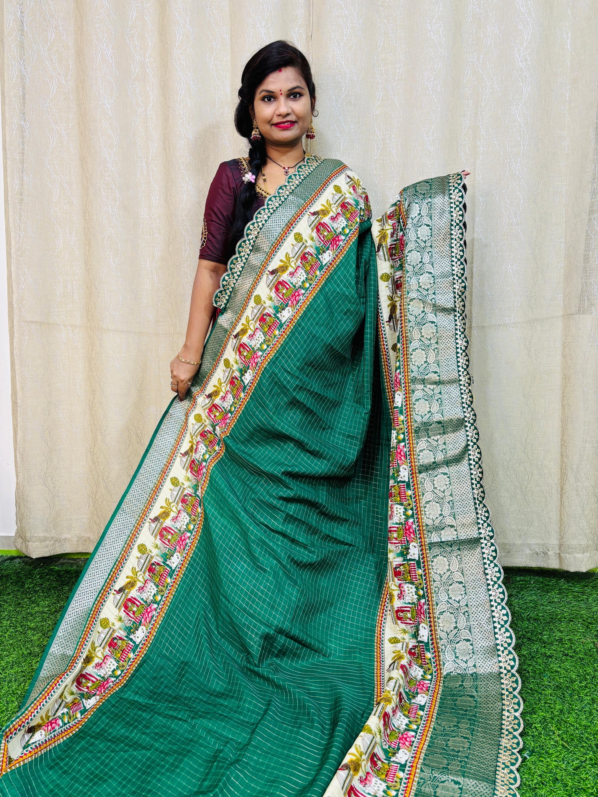 అద్భుతమైన మధుబని ప్రింట్లు మరియు సున్నితమైన స్కాలోప్ బార్డర్లను కలిగి ఉన్న మా అందమైన ప్రీమియం మంగళగిరి చీర యొక్క సొగసును అనుభవించండి. ఈ సాంప్రదాయ చీర ఆధునిక టచ్తో కూడిన ప్రత్యేకమైన రన్నింగ్ బ్లౌజ్ కాన్సెప్ట్తో వస్తుంది. అత్యుత్తమ పదార్థాలతో తయారు చేయబడిన ఇది నిజంగా కేవలం 850 రూపాయలకే దొంగతనం.