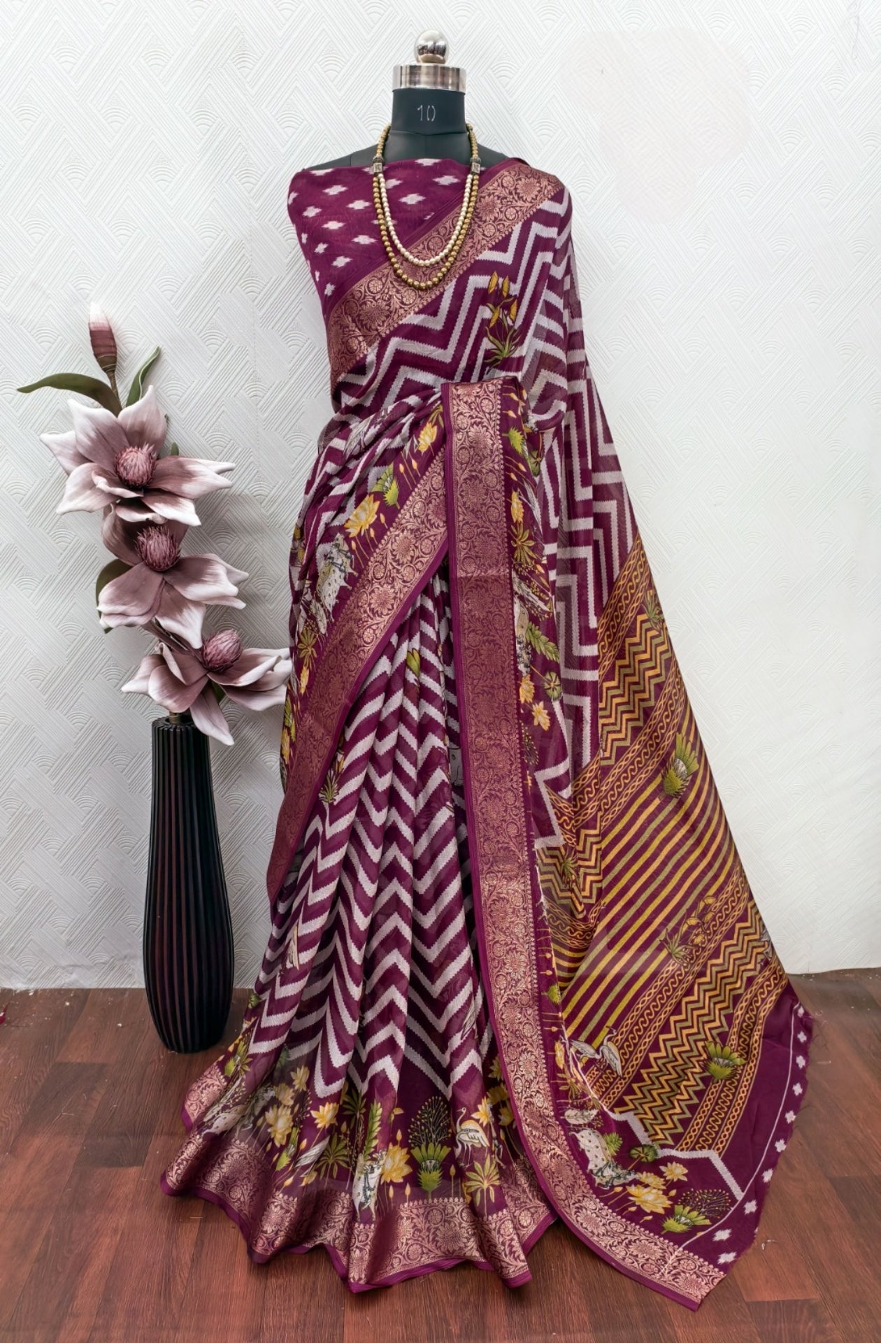 Discover the beauty and tradition of Marshmallow Lehariya Patterns sarees, enhanced by delicate Pichwai borders. Immerse yourself in colorful and intricate patterns that truly showcase the artistry of Indian culture. Elevate your wardrobe with this stunning and timeless piece.