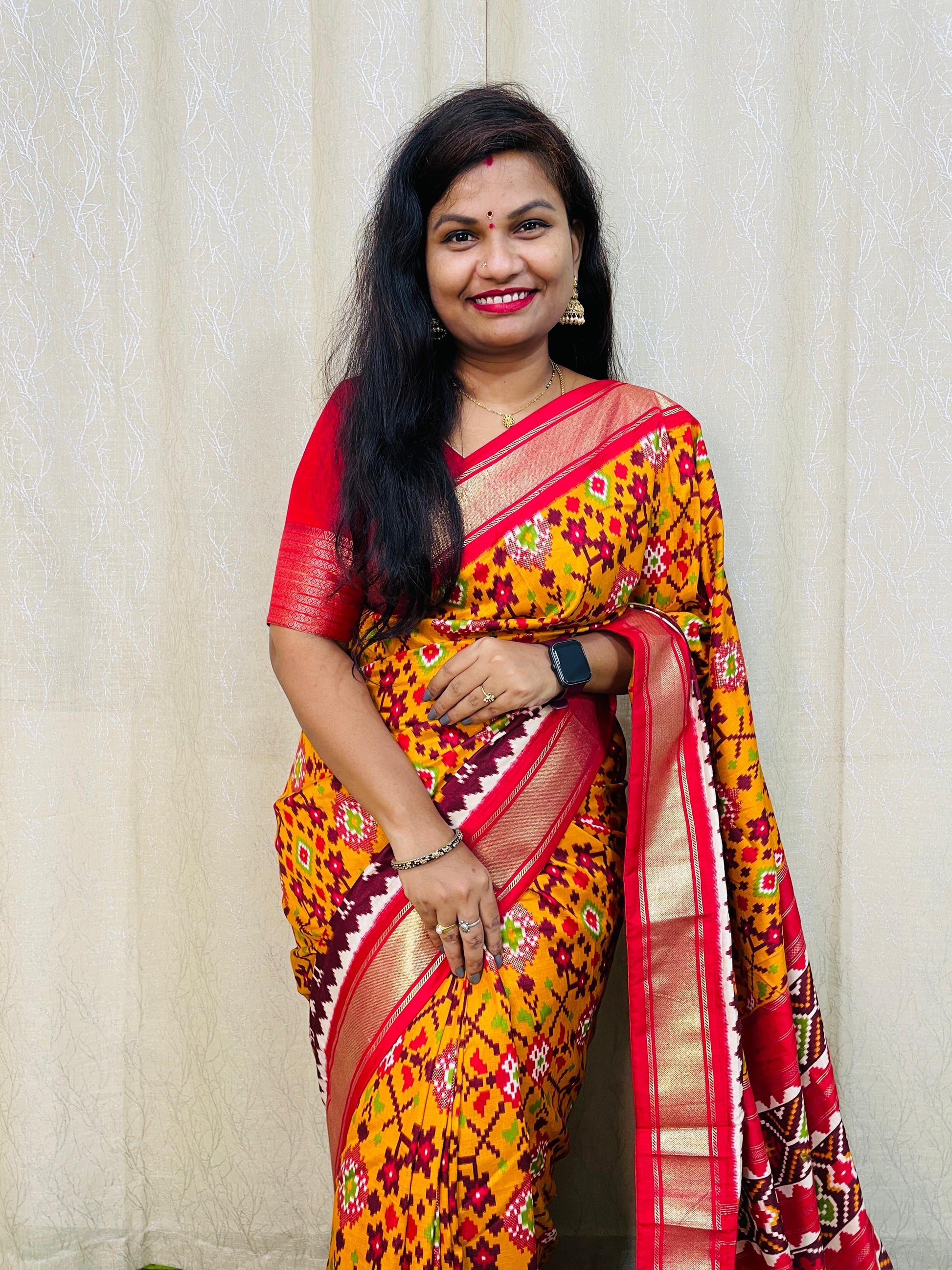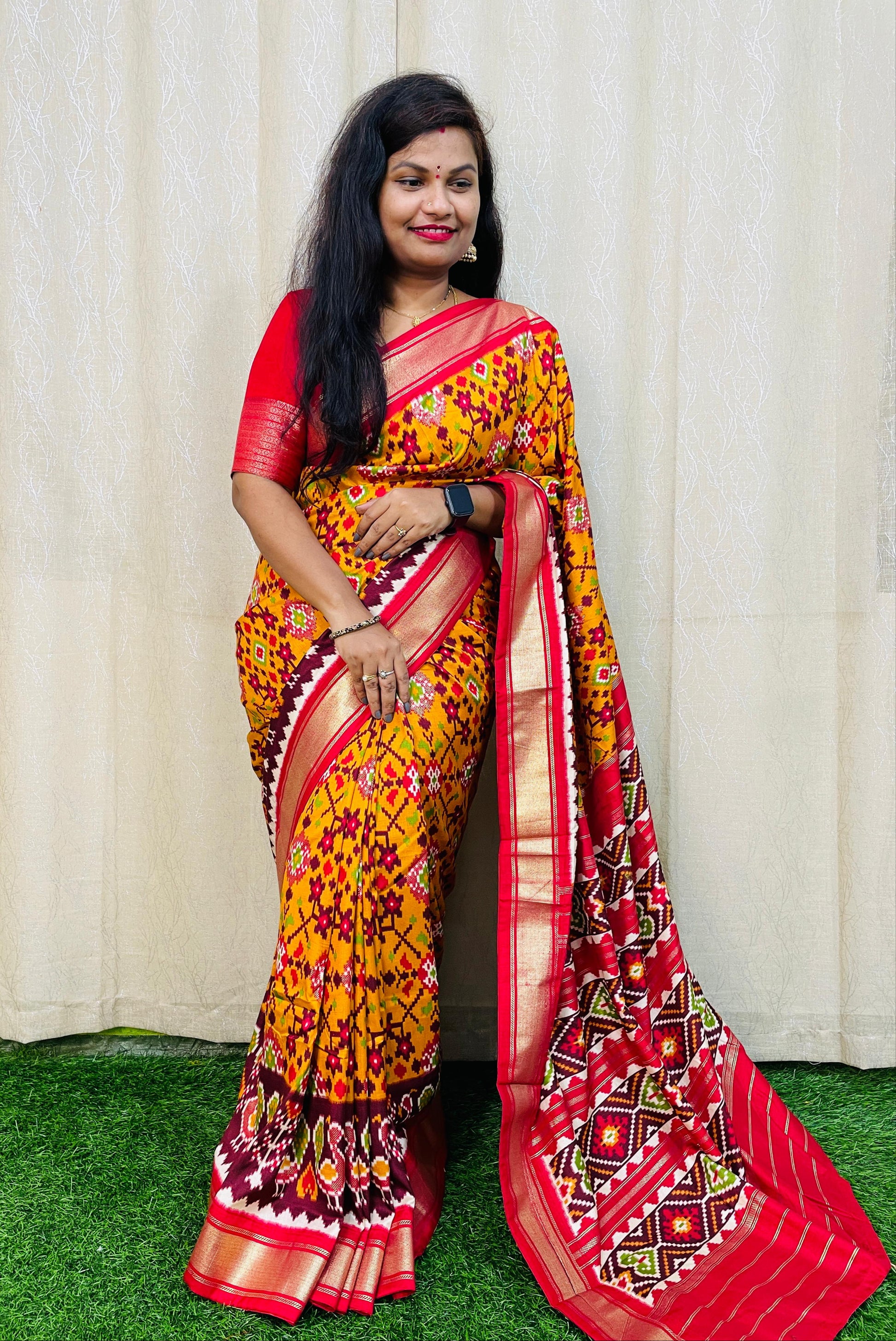 ఇక్కత్ పోచంపల్లి ప్రింట్లతో బ్రాండెడ్ మూంగా సాఫ్ట్ సిల్క్ చీరలు