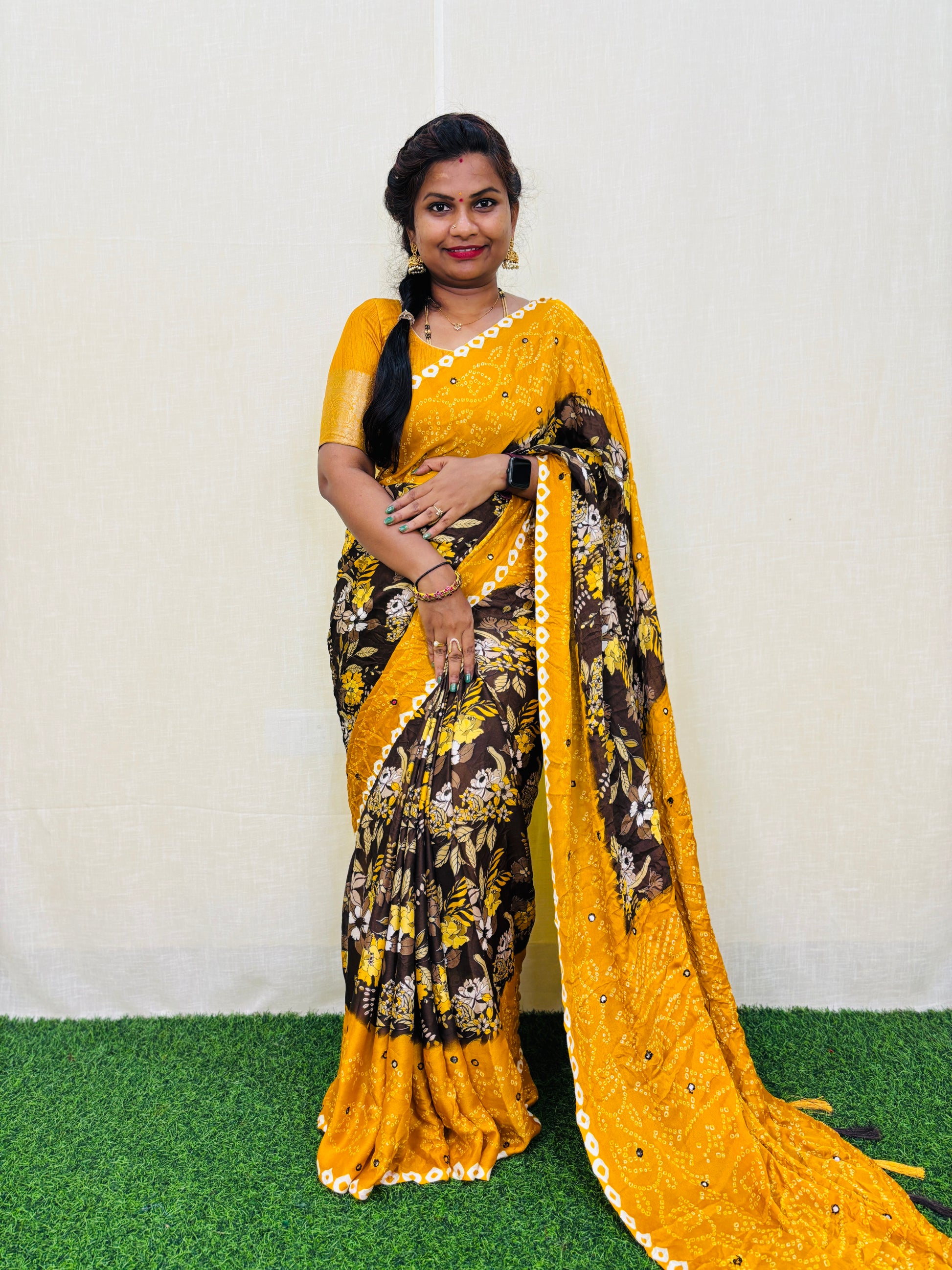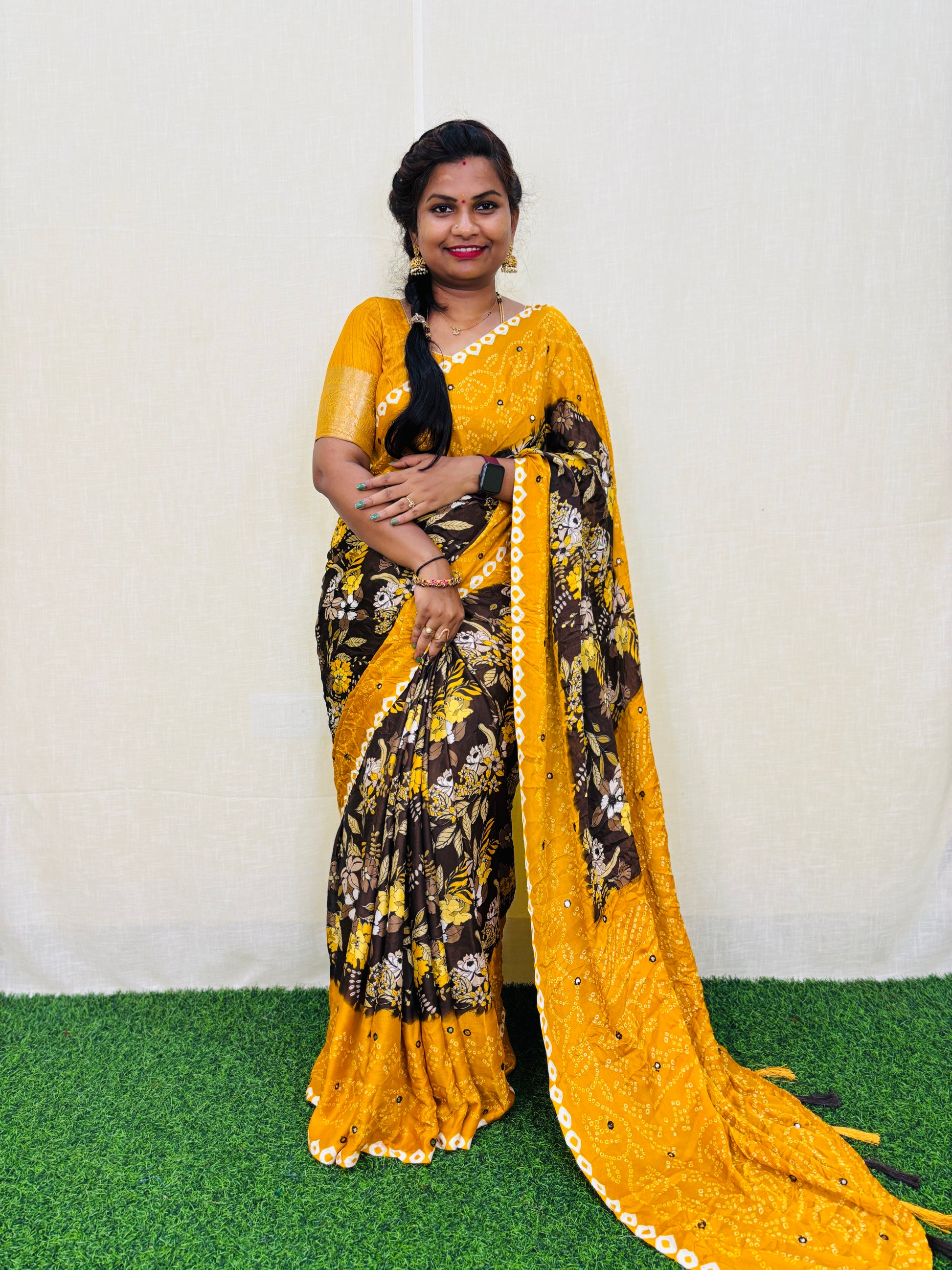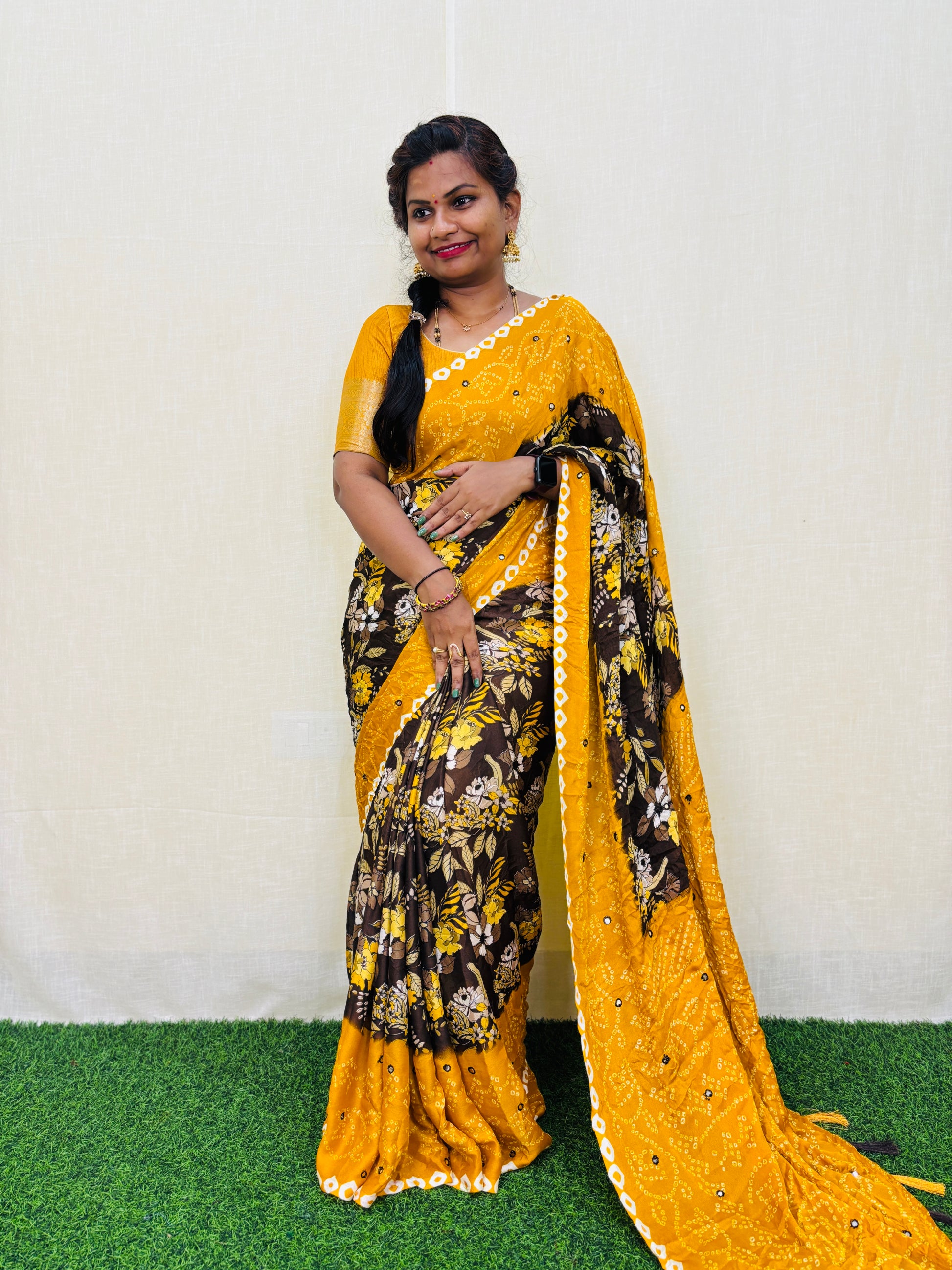 Add a touch of elegance to your wardrobe with our Moss chiffon saree featuring a stunning floral print. The saree is embellished with foil mirror work, adding a subtle shine. Comes with a contrast blouse for a perfect finishing touch. Elevate your style with this versatile and beautiful saree.