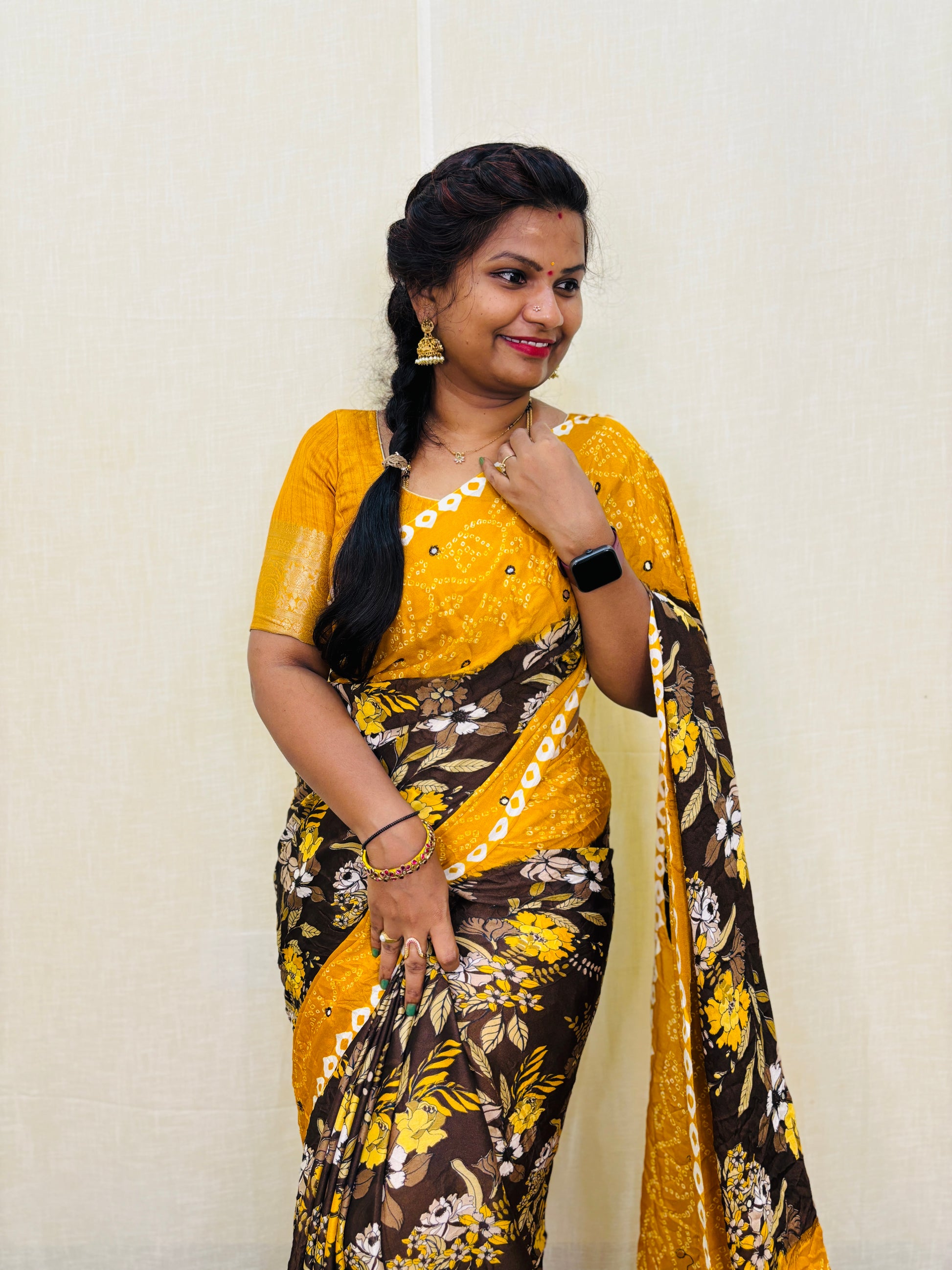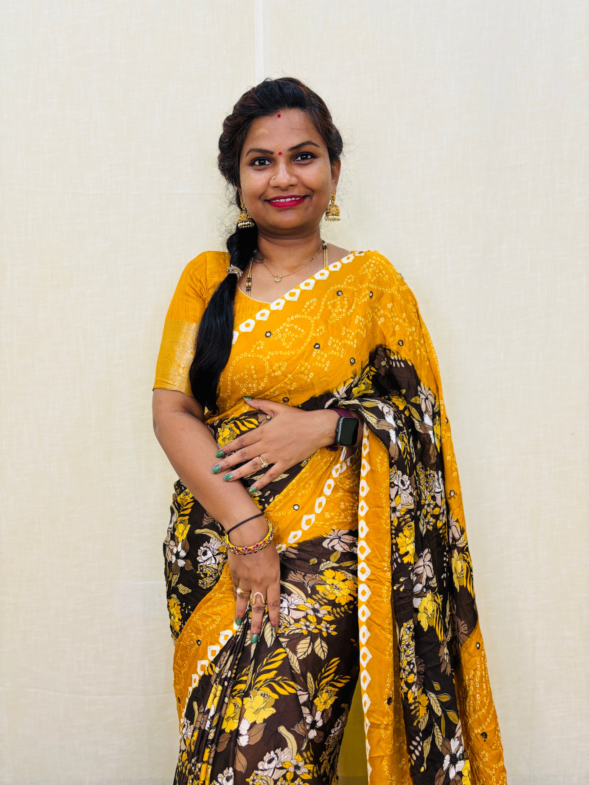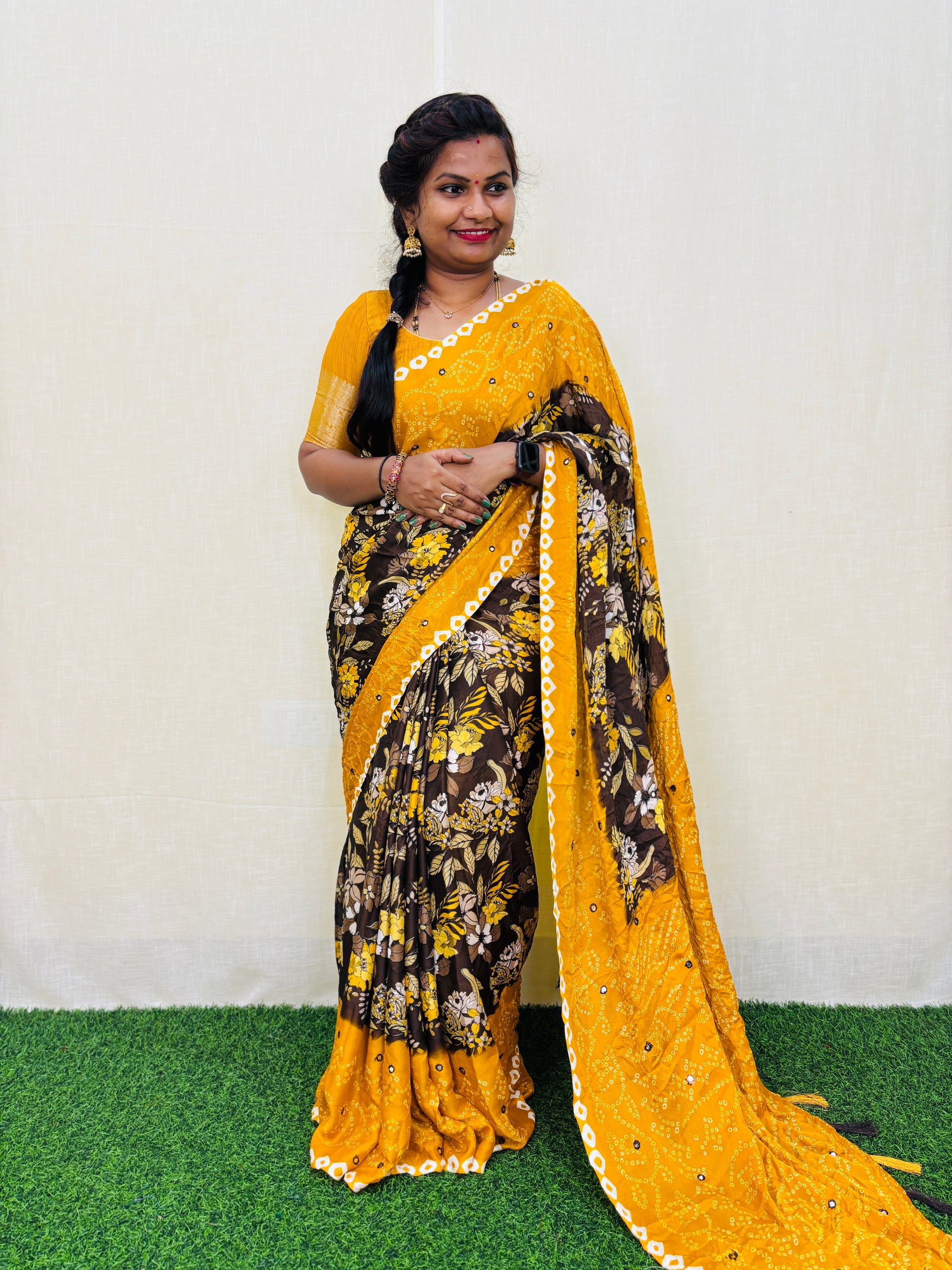 Add a touch of elegance to your wardrobe with our Moss chiffon saree featuring a stunning floral print. The saree is embellished with foil mirror work, adding a subtle shine. Comes with a contrast blouse for a perfect finishing touch. Elevate your style with this versatile and beautiful saree.