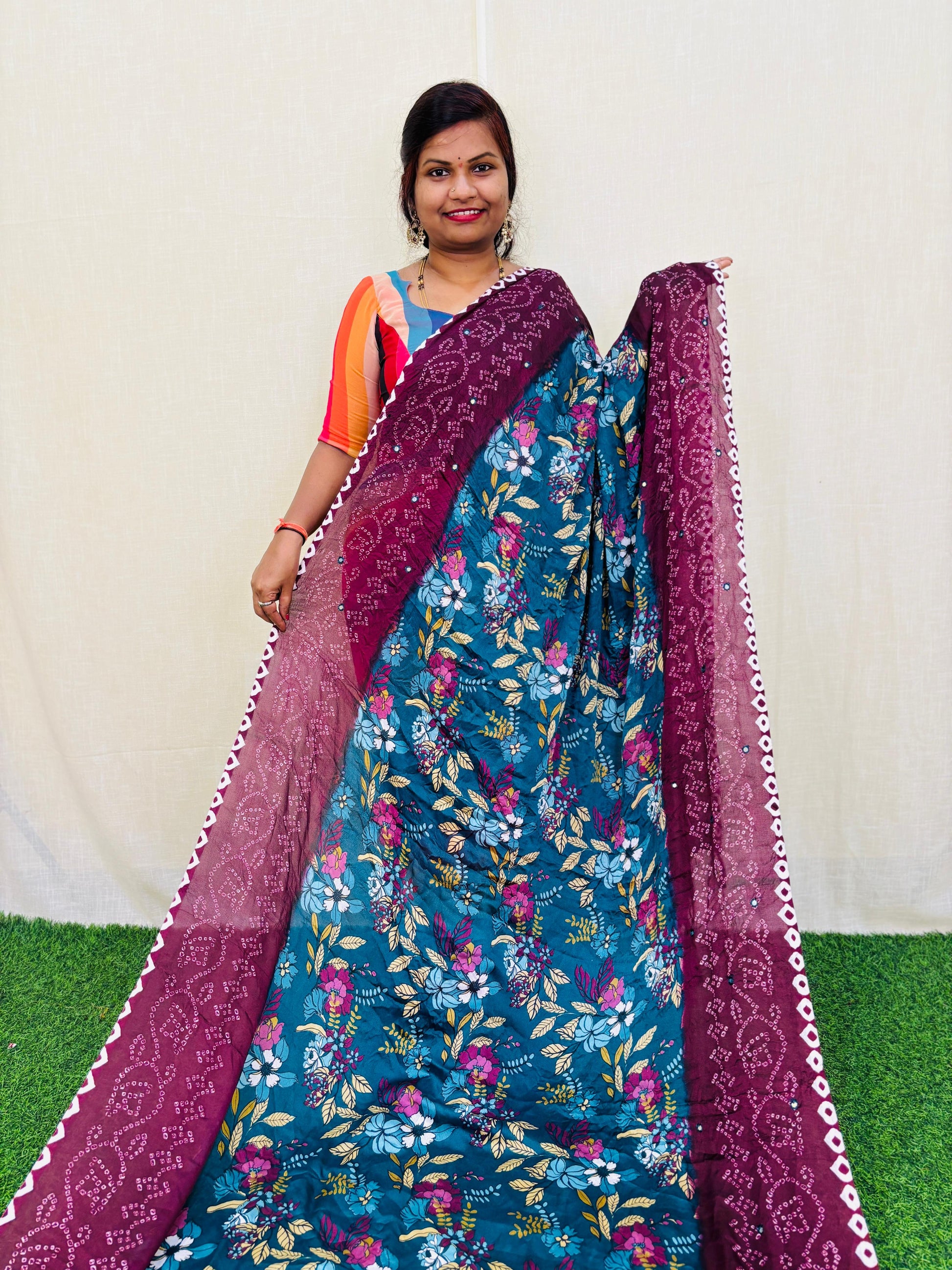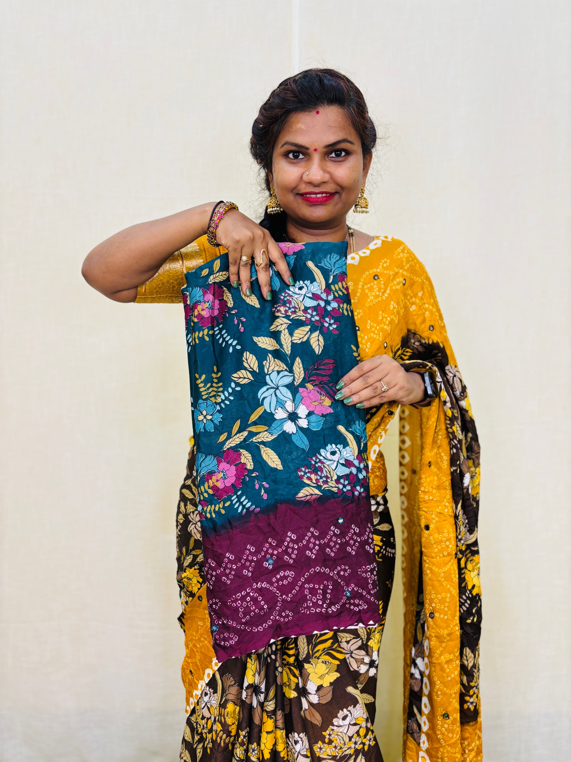 Add a touch of elegance to your wardrobe with our Moss chiffon saree featuring a stunning floral print. The saree is embellished with foil mirror work, adding a subtle shine. Comes with a contrast blouse for a perfect finishing touch. Elevate your style with this versatile and beautiful saree.