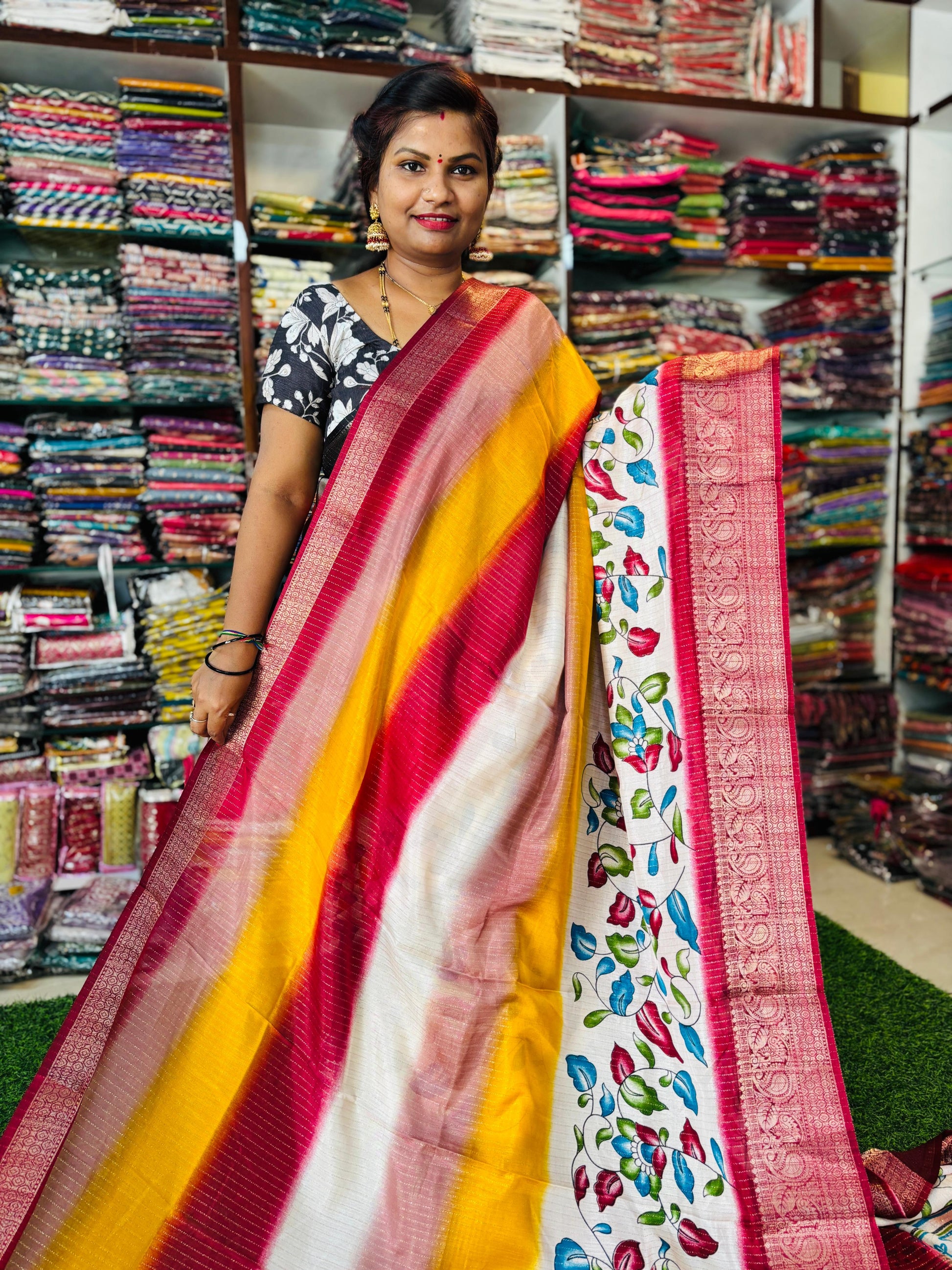 మల్టీ కలర్ క్రేప్ యొక్క ఉత్సాహభరితమైన ప్రపంచాన్ని అన్వేషించండి - ఇది ప్రత్యేకమైన జరీ నేత మరియు అద్భుతమైన కలంకారి ప్రింటెడ్ బార్డర్లను కలిగి ఉన్న అందమైన ఫాబ్రిక్. ఈ బహుముఖ పదార్థంతో ప్రత్యేకంగా నిలబడండి, ఏ సందర్భానికైనా సరిపోతుంది. స్టైలిష్ కాంట్రాస్ట్ బ్లౌజ్తో లుక్ను పూర్తి చేయండి. ఇప్పుడే దీన్ని కేవలం 499/-కి పొందండి.