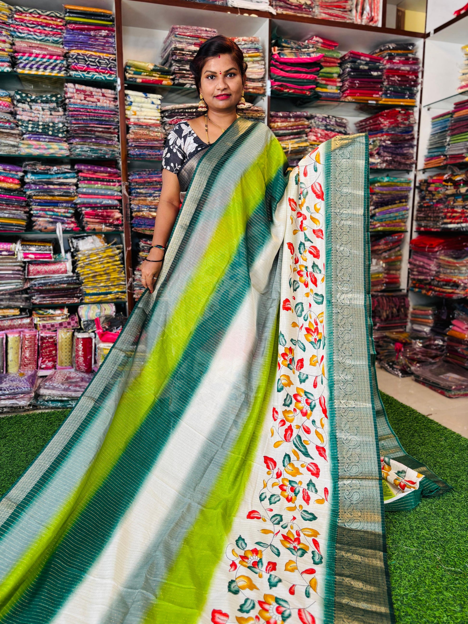 మల్టీ కలర్ క్రేప్ యొక్క ఉత్సాహభరితమైన ప్రపంచాన్ని అన్వేషించండి - ఇది ప్రత్యేకమైన జరీ నేత మరియు అద్భుతమైన కలంకారి ప్రింటెడ్ బార్డర్లను కలిగి ఉన్న అందమైన ఫాబ్రిక్. ఈ బహుముఖ పదార్థంతో ప్రత్యేకంగా నిలబడండి, ఏ సందర్భానికైనా సరిపోతుంది. స్టైలిష్ కాంట్రాస్ట్ బ్లౌజ్తో లుక్ను పూర్తి చేయండి. ఇప్పుడే దీన్ని కేవలం 499/-కి పొందండి.