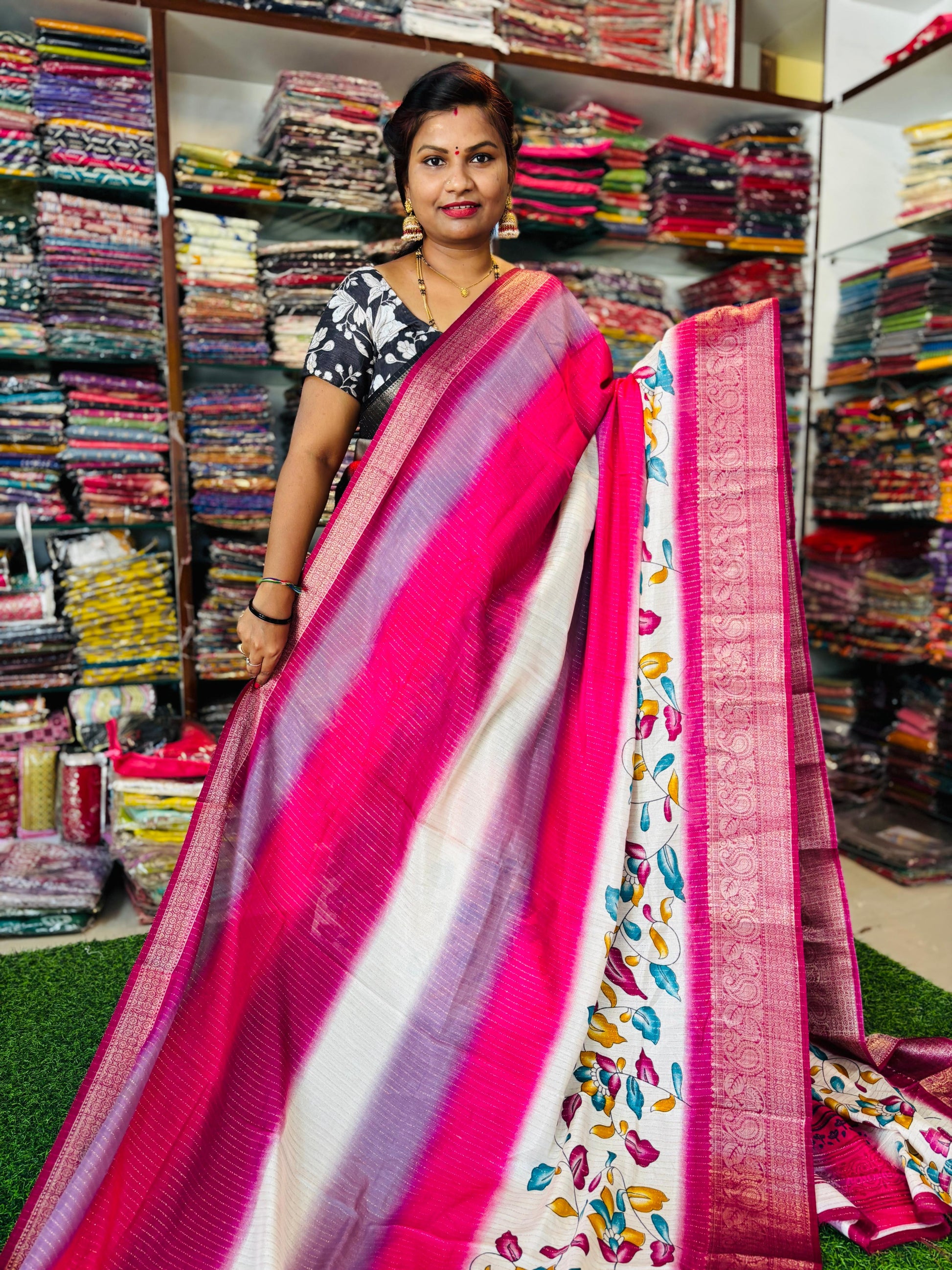 మల్టీ కలర్ క్రేప్ యొక్క ఉత్సాహభరితమైన ప్రపంచాన్ని అన్వేషించండి - ఇది ప్రత్యేకమైన జరీ నేత మరియు అద్భుతమైన కలంకారి ప్రింటెడ్ బార్డర్లను కలిగి ఉన్న అందమైన ఫాబ్రిక్. ఈ బహుముఖ పదార్థంతో ప్రత్యేకంగా నిలబడండి, ఏ సందర్భానికైనా సరిపోతుంది. స్టైలిష్ కాంట్రాస్ట్ బ్లౌజ్తో లుక్ను పూర్తి చేయండి. ఇప్పుడే దీన్ని కేవలం 499/-కి పొందండి.