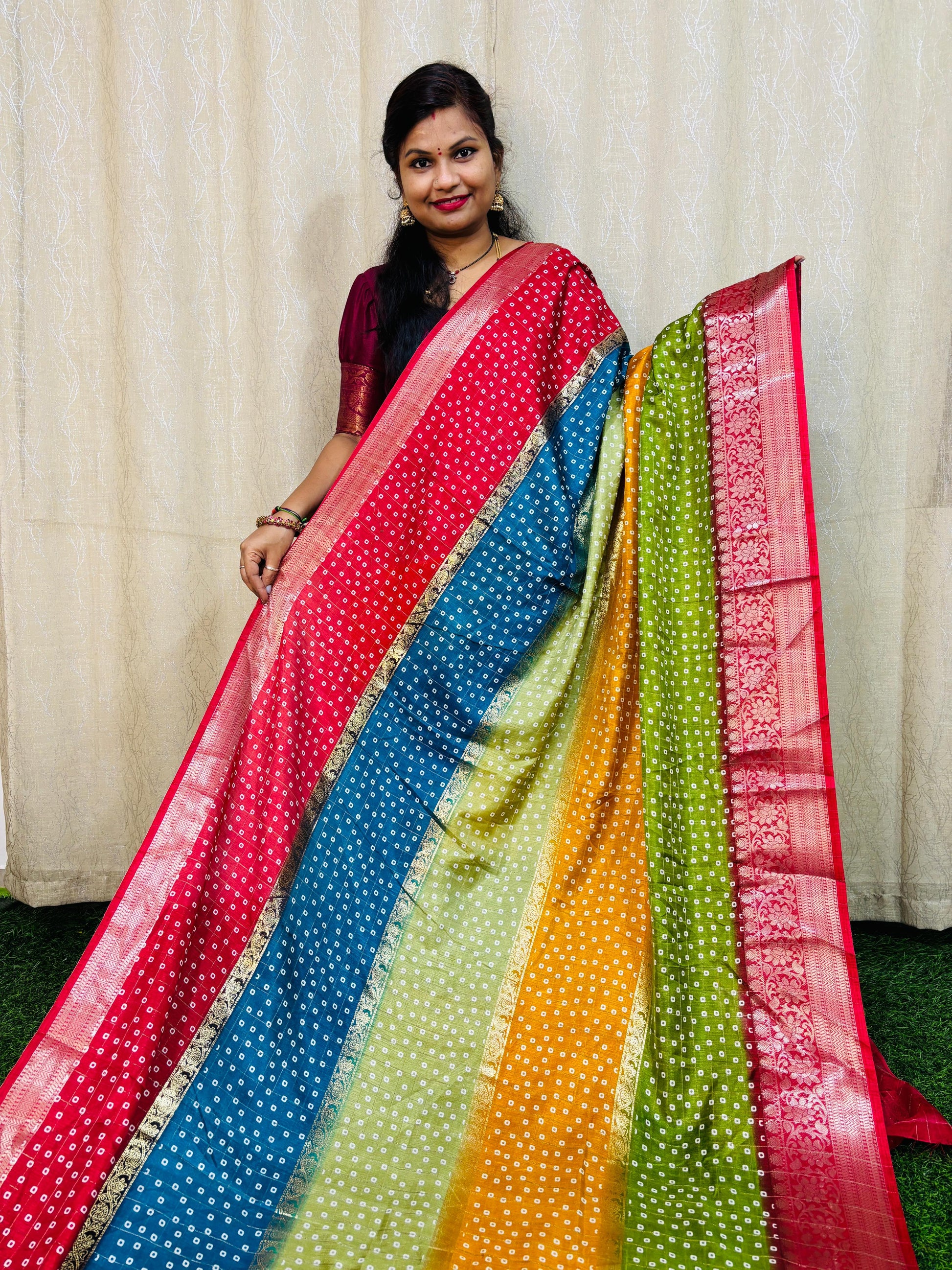 మా అందమైన మల్టీ కలర్ డోలా క్రేప్ సిల్క్ చీరలను పరిచయం చేస్తున్నాము - సాంప్రదాయ మరియు ఆధునిక సౌందర్యాల పరిపూర్ణ మిశ్రమం. అధిక-నాణ్యత పట్టుతో తయారు చేయబడిన ఈ చీరలు మృదువైనవి, తేలికైనవి మరియు అద్భుతమైన బహుళ-రంగు డిజైన్ను కలిగి ఉంటాయి. ఈ ప్రత్యేకమైన మరియు సొగసైన ముక్కతో మీ వార్డ్రోబ్ను పెంచుకోండి. ఇప్పుడే మీది కేవలం 750/-కి పొందండి.