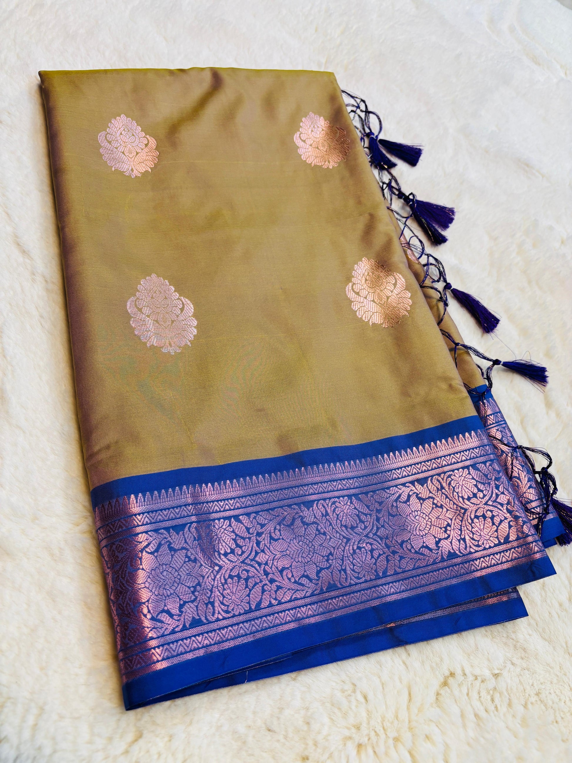 Expertly crafted, the Offer Moonga Pattu saree features a dual shade design with intricate zari weaving borders and all over butties. Its rich pallu and contrast blouse add an elegant touch to this traditional attire. Experience the timeless beauty and luxury of this saree.