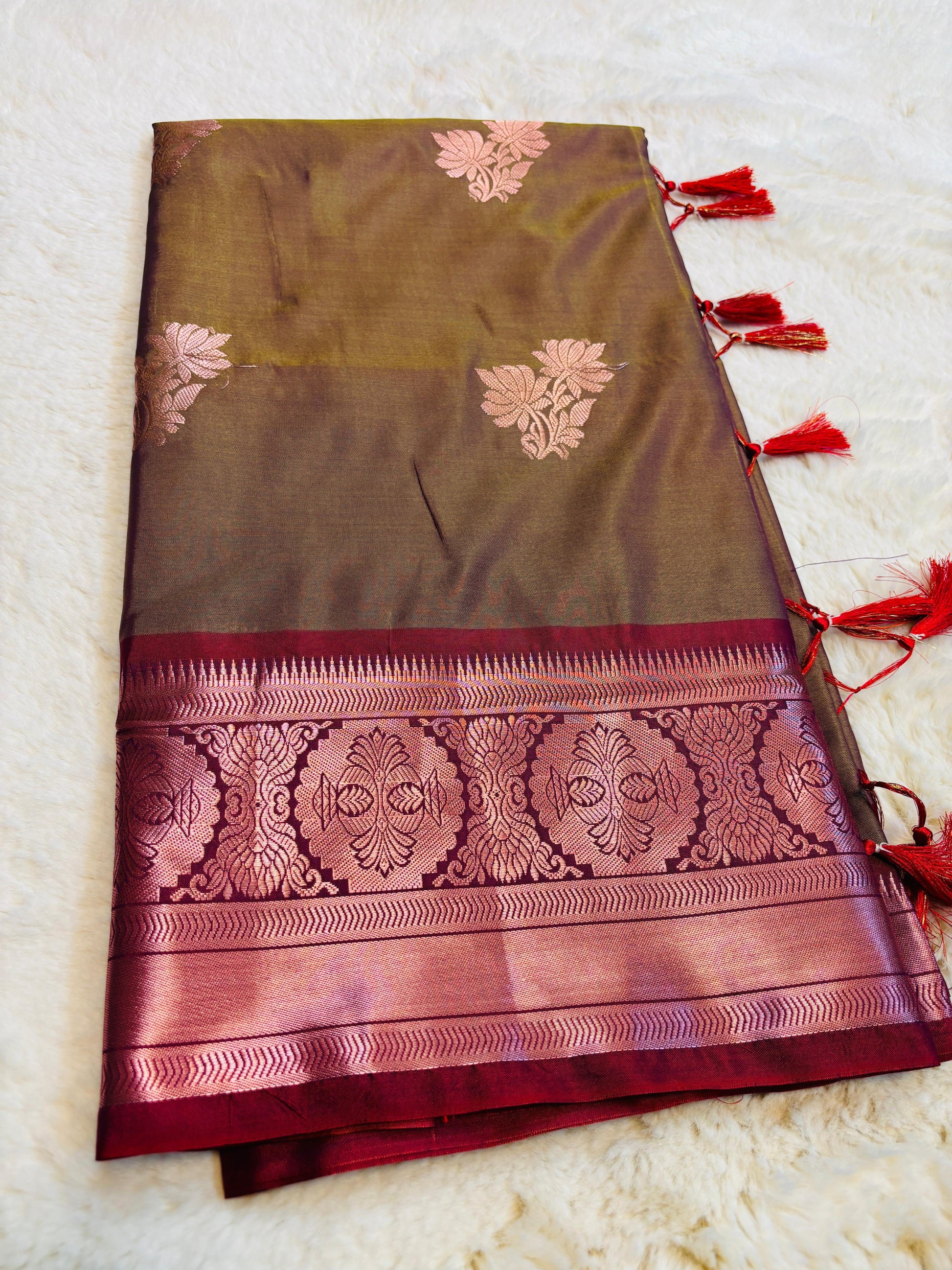 Expertly crafted, the Offer Moonga Pattu saree features a dual shade design with intricate zari weaving borders and all over butties. Its rich pallu and contrast blouse add an elegant touch to this traditional attire. Experience the timeless beauty and luxury of this saree.