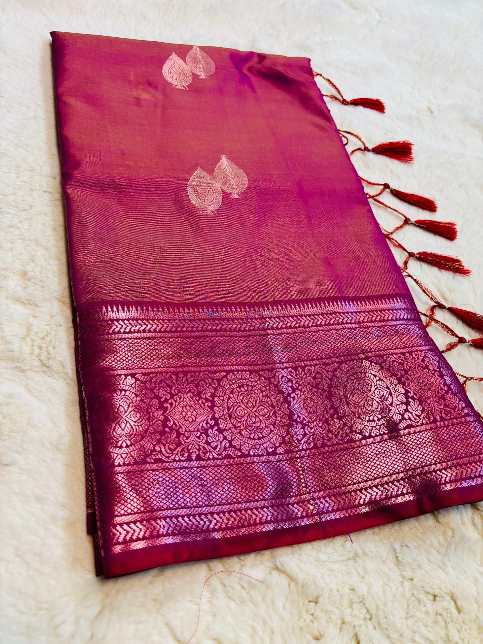 Expertly crafted, the Offer Moonga Pattu saree features a dual shade design with intricate zari weaving borders and all over butties. Its rich pallu and contrast blouse add an elegant touch to this traditional attire. Experience the timeless beauty and luxury of this saree.