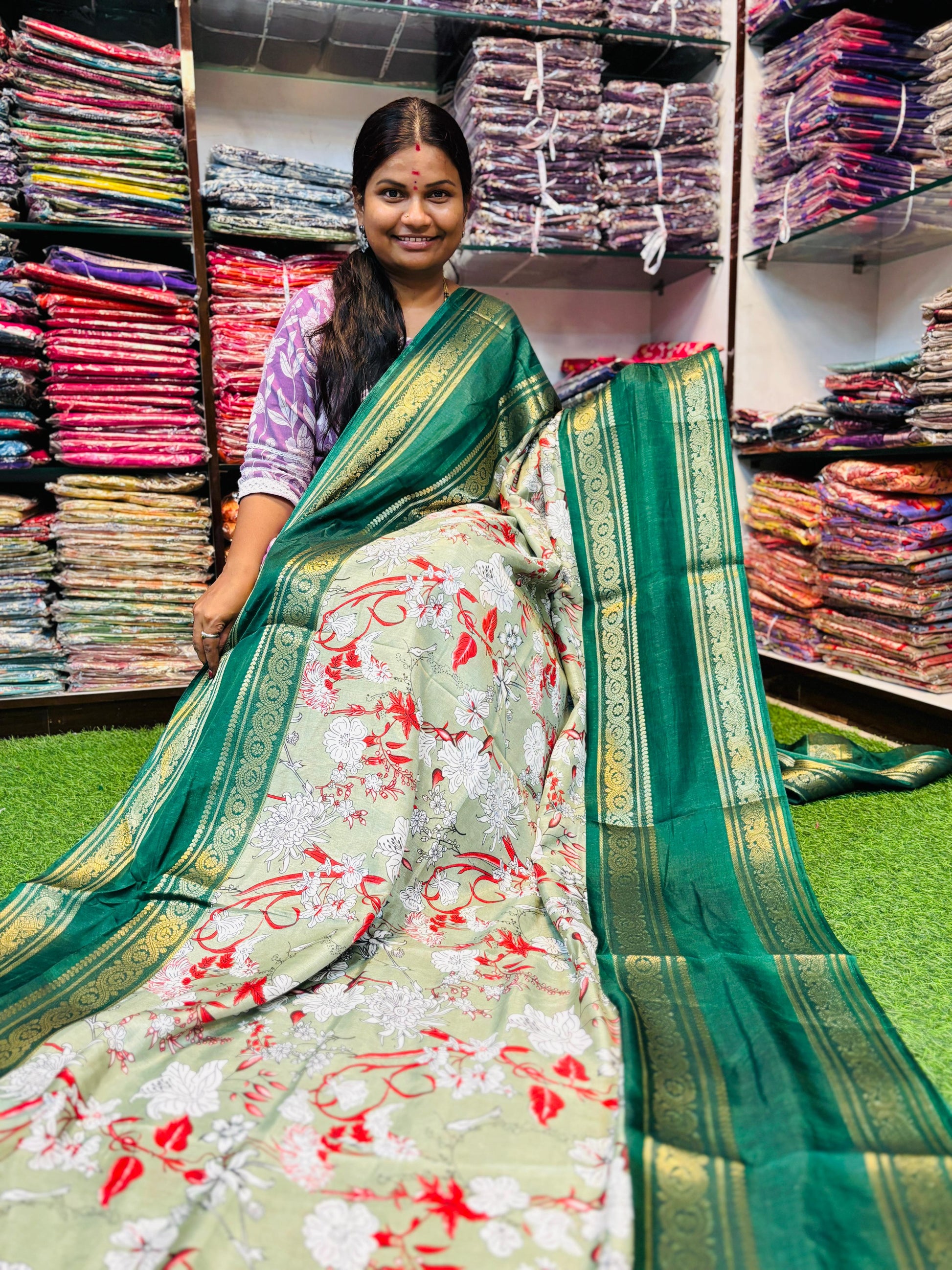 Explore the graceful world of Semi Dola Mysore Crepe sarees, featuring the unique Double Gap border concept that adds a touch of sophistication. Adorned with a stunning all over kalamkari print, these sarees are the perfect blend of tradition and modernity. Complete the look with a contrast blouse.