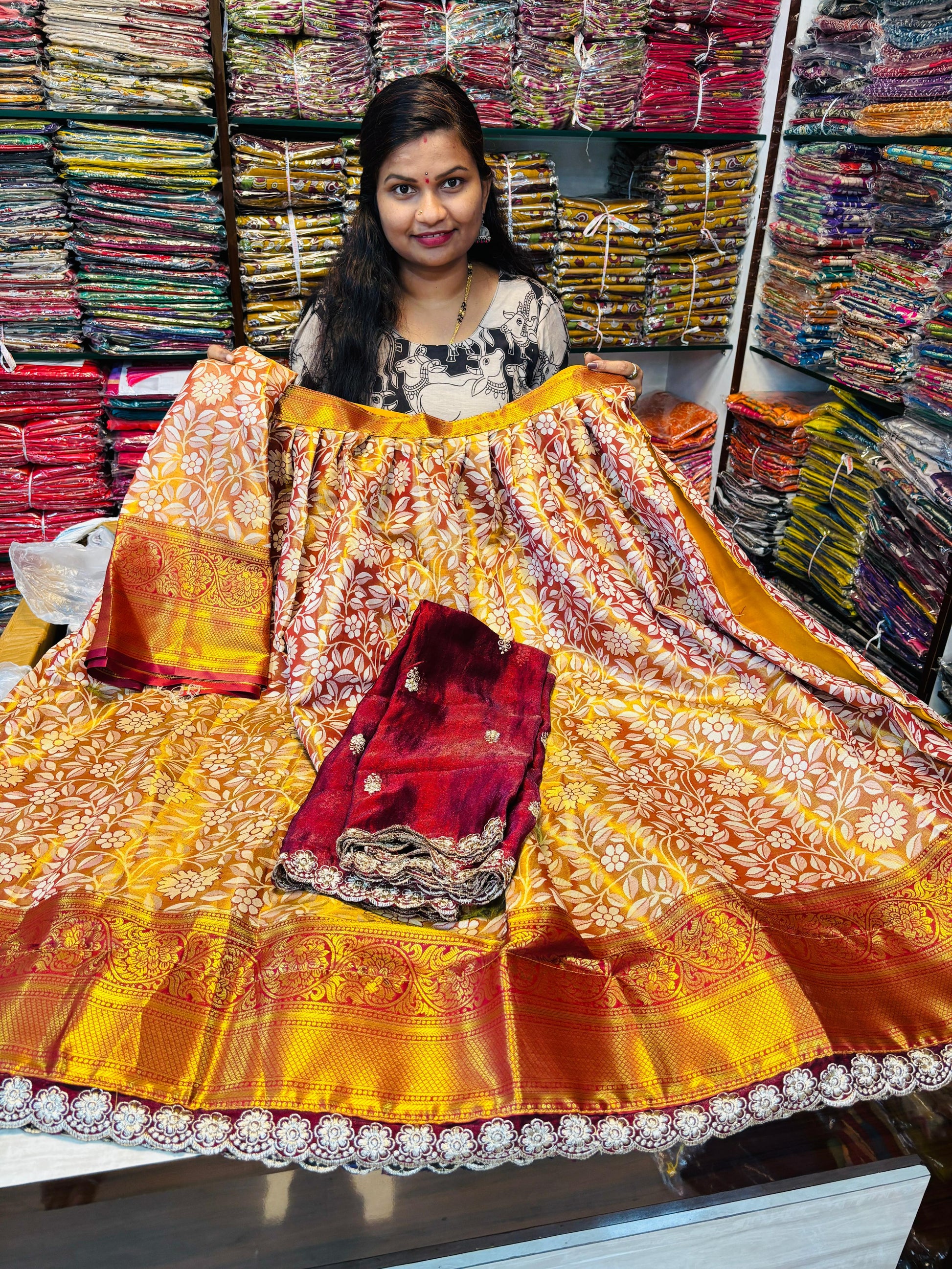 Discover the timeless elegance of Banaras Pattu Lehanga with cut work borders. These Lehanga are skillfully woven with intricate details that elevate their beauty. With a Chinnon duppata included, this stunning lehanga set is perfect for any occasion. Get yours now at an affordable price of 1950/-.